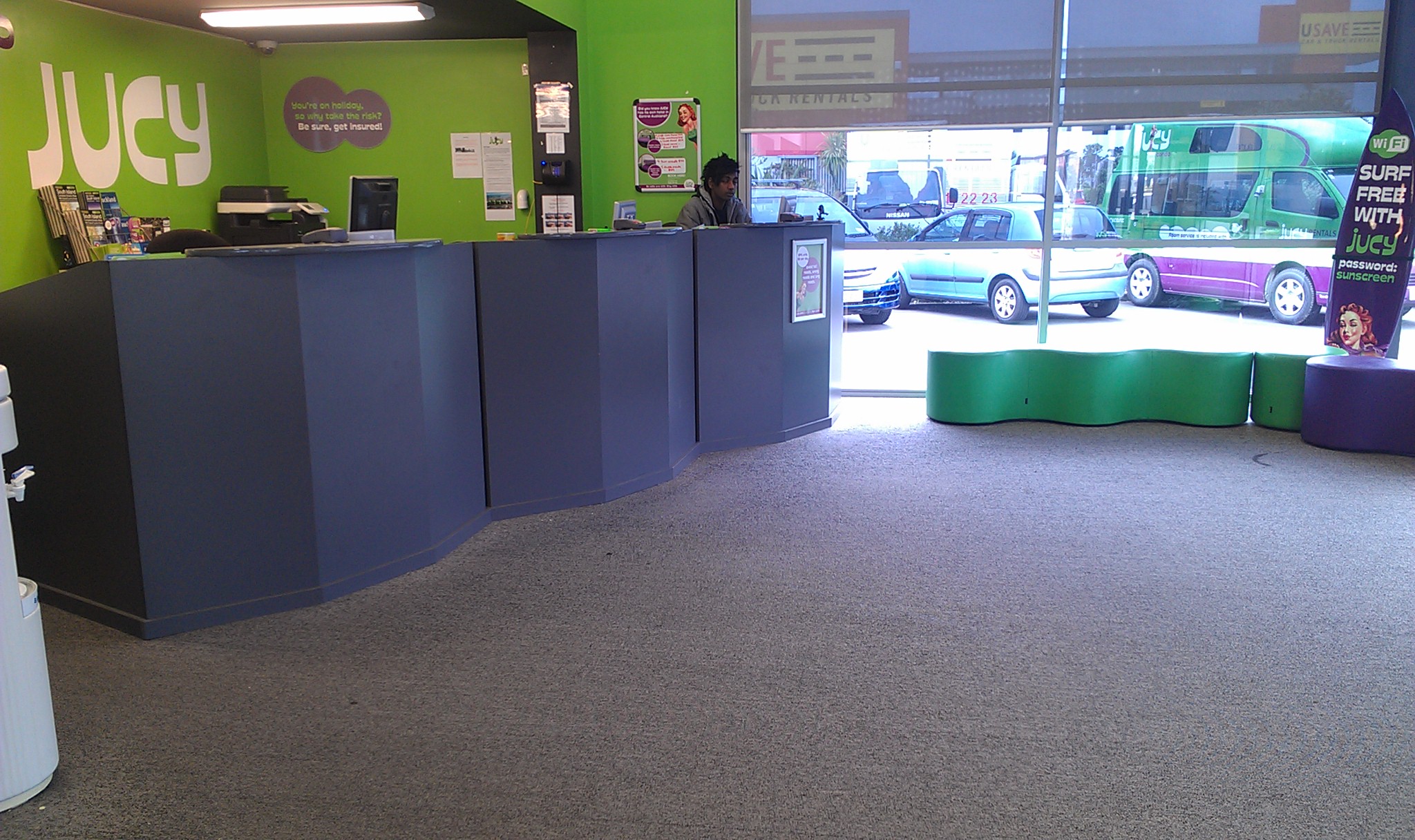 JUCY的服務人員在八點準時出現,花了五分鐘把我們載到機場旁邊的服務中心,隨後由服務人員跟我們進行車輛介紹。服務中心也裝潢地符合JUCY一貫的綠紫風格。