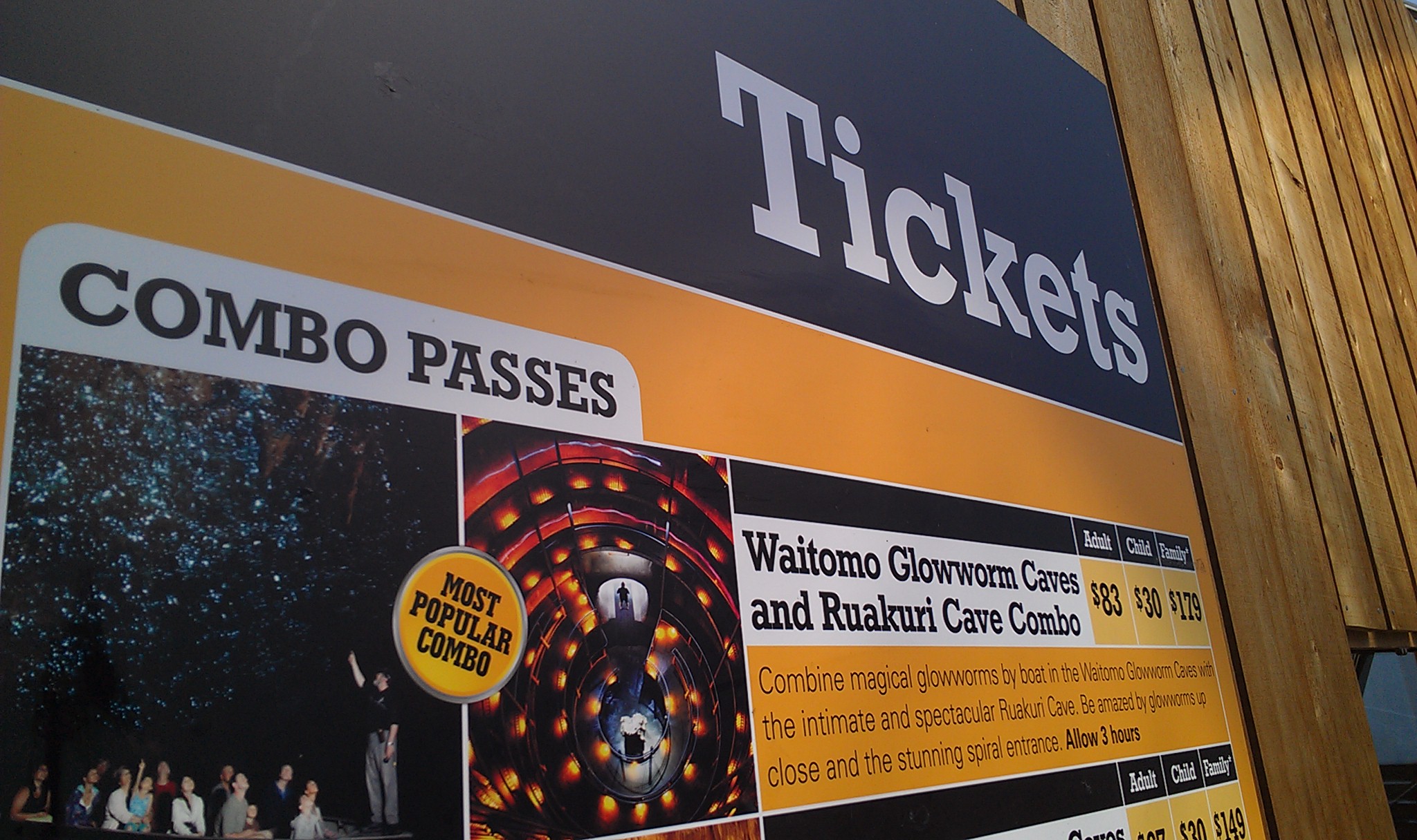 (下圖) 參加的套裝行程: Rukuri鐘乳石洞+Waitomo Gloworm Cave螢火蟲洞。因為天氣的關係,我們沒有選擇黑水漂流。