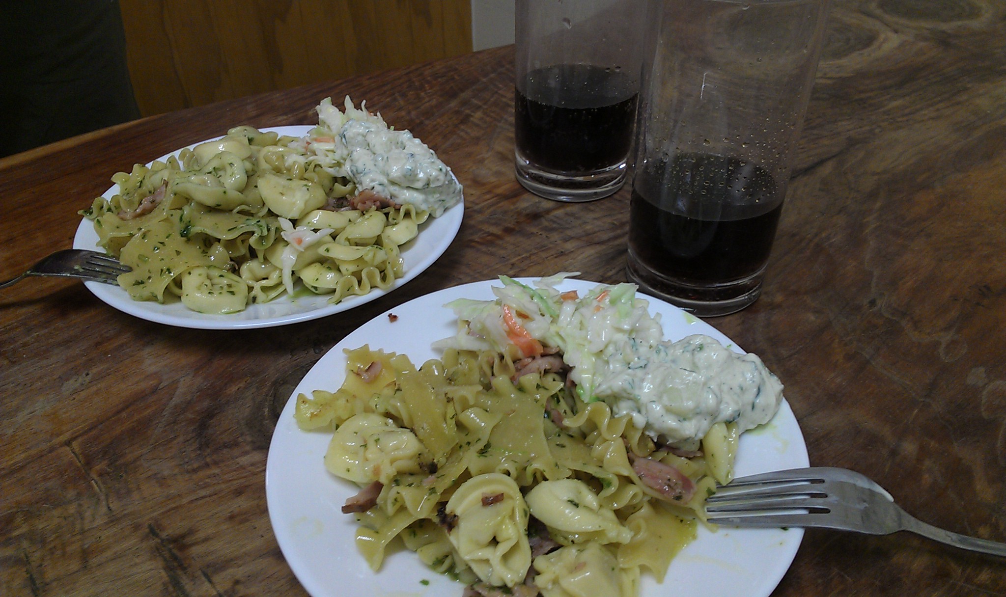 第一餐,我們是在露營地廚房做的。我買了義大利寬麵跟義大利餃,加上 Pesto(九層塔醬)拌炒,配菜是Cole Slaw(高麗菜絲)跟洋芋沙拉,多半是現成品。