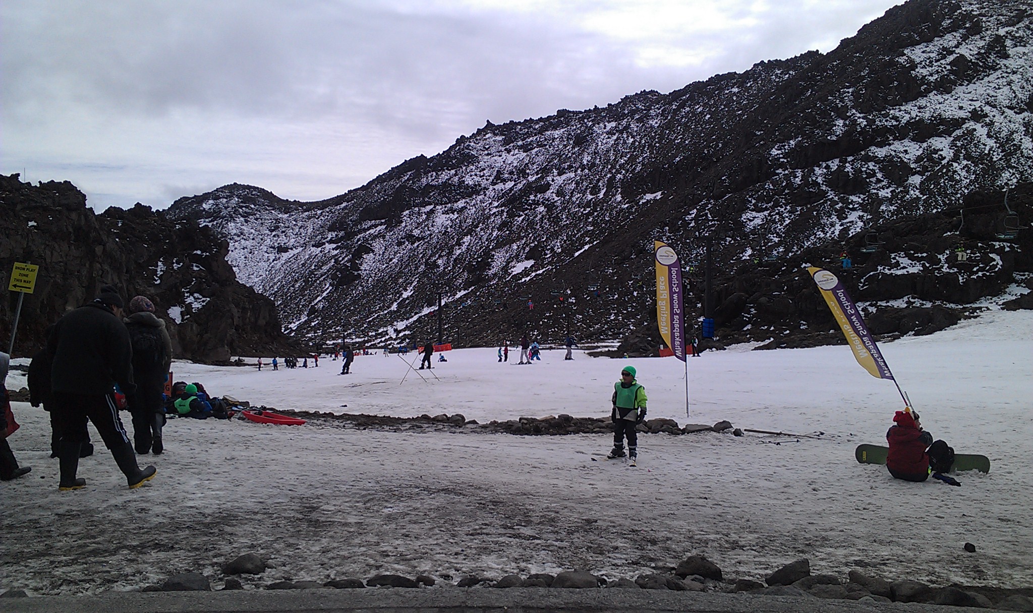 Whakapapa滑雪場比較大,尤其是初學者區域。我們購買了類似昨天的 Explorer課程套票(紐幣155元),賣票的說我們的程度可以,不過到了課程中心時,服務人員建議要練習幾天後才比較適合,我們稍微貼了點錢將課程換成私人教練,在中午12點開始上。這樣我們還可以稍微練習一下。 Whakapapa的初學者區域,稱之為 Happy Valley(終於有個好念一點的地名了)。有纜車,電梯還有T-Bar三種上升方式,區域跟坡度也比較困難一點。Happy Valley不在入口處,要坐另一個纜車往下走。不過,裝備可以在 Happy Valley 直接租。