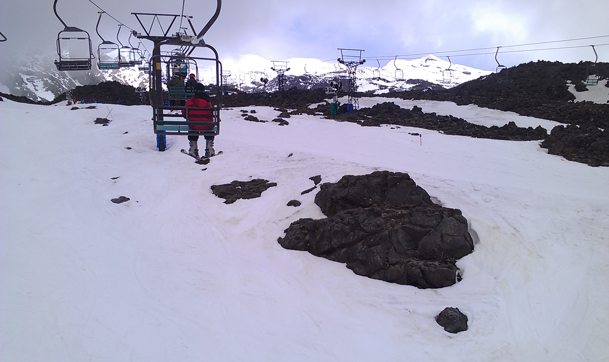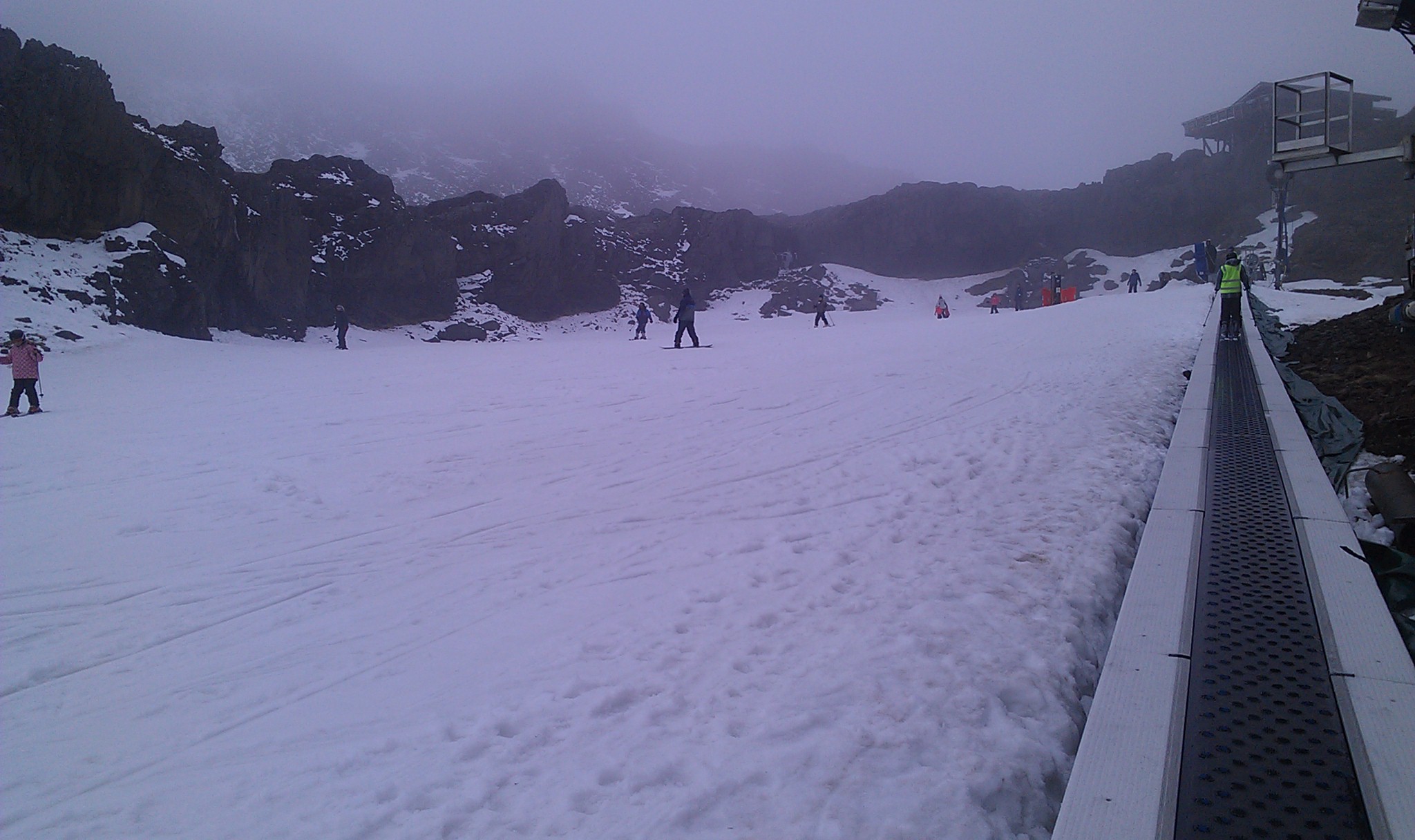 第二天的雪況沒有比第一天好,我們也終於學到乾雪跟濕雪的差別。今天的雪比較濕一點(可以參考上圖),在結冰後的速度比較快,讓我們的自主練習有點險象環生,而我又在纜車下車時滑倒了(後來才知道,從座位上起身時,重心要向前)。還好,私人教練課程拯救了我們,讓我們的過彎技術更加純熟。我們的教練在北半球的冬天是在日本教課,然後南半球的冬天到紐西蘭,他本身是捷克人。他說,捷克可是一個冬季奧運的強國呢(我只能做恍然大悟的表情囉)。