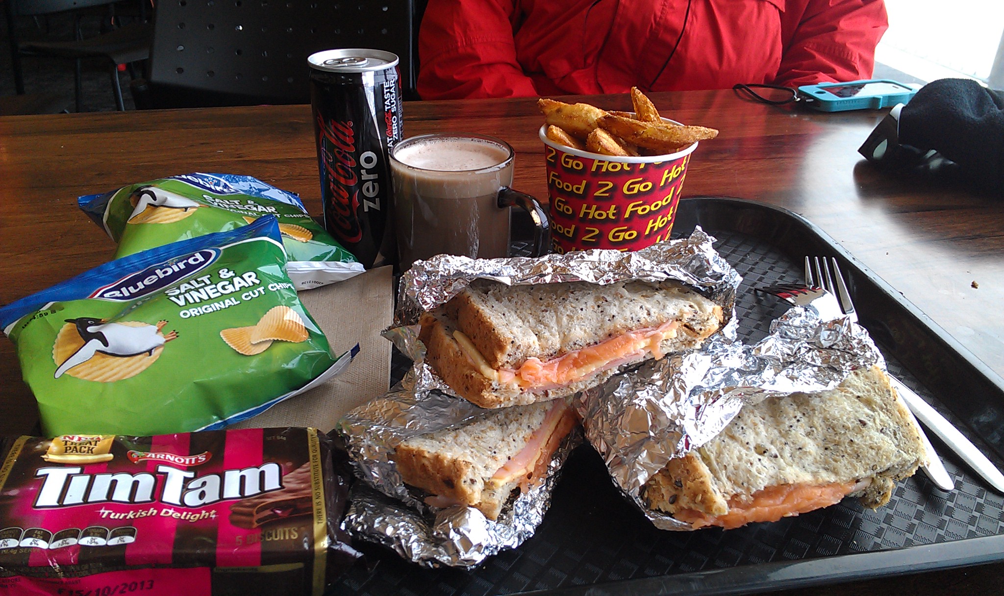 上完課,往山頂的纜車坐了非常地久,而且到了山頂幾乎已經沒有能見度可言了。山上的餐廳很漂亮,我們照例拿出我們的三明治,不過今天有買餐廳的薯條與熱可可。山上很多學生團體,他們來滑雪就好像是來校外教學一樣,這些學生已經可以從山頂一路滑下去了,真的很厲害。