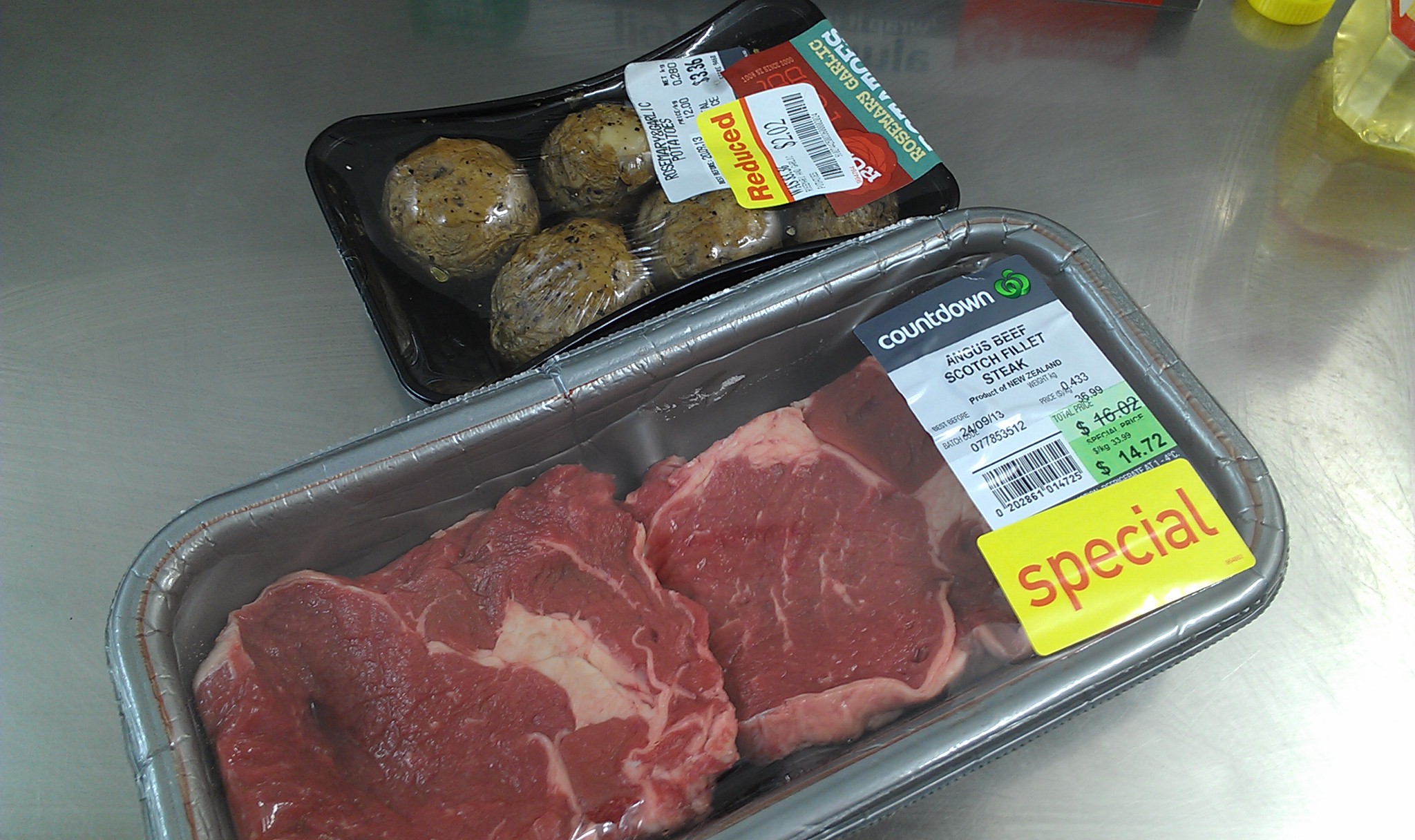 今天在超市看到了安格斯牛肉特價,所以連續第二晚吃牛排。廚房與餐廳很新穎,電爐跟烤箱都非常乾淨,這麼乾淨讓我都不大敢起油鍋了。美中不足的是,廚具是要另外去借的,不過服務人員已經下班了,讓烤牛排的步驟稍微有點克難。