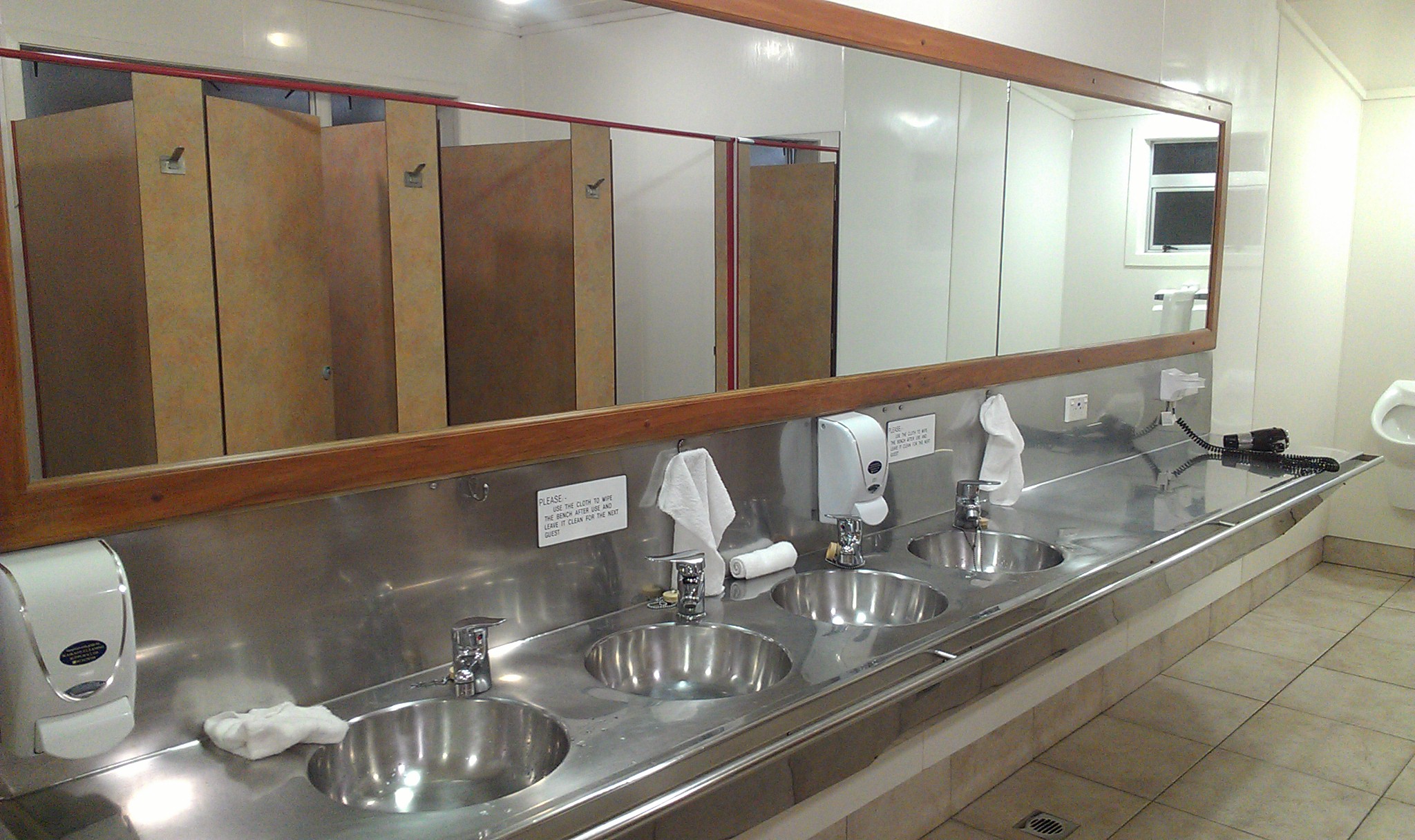 浴室沒有Ohkune這麼酷的暖燈,但是也是相當乾淨。在使用前,要按一顆按鈕,並且上面寫一次熱水只供應七分鐘,算是提醒露營客善用資源的作法。我總之沒有被冷到,我覺得上面寫的可能是提醒性質居多吧。每一個洗手台旁邊都有一塊布,希望旅客在使用後可以隨手請理,永保五星級的廁所水準。
