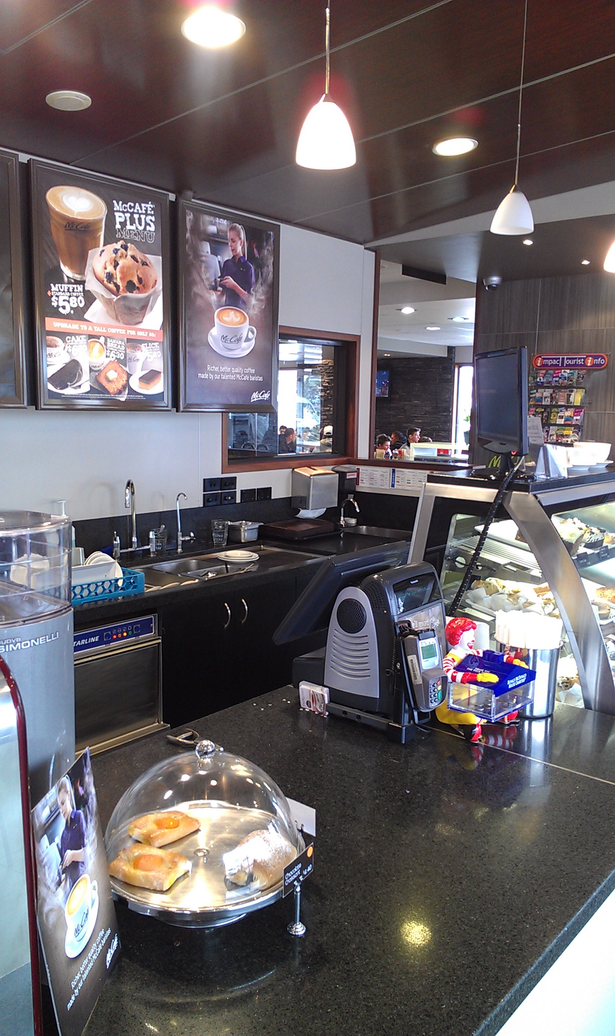 我在湖邊稍微躺了一下,才發現原來不只是有點想睡,可能還有點感冒了,畢竟這邊溫差實在有點大。這也是露營車的好處了,車後就是一張床,走到哪躺到哪。天天喝即溶咖啡,我也覺得體內的咖啡因不大夠了(應該戒咖啡的),就前往湖邊的麥當勞買咖啡。這邊的麥當勞生意非常的好,McCafe的櫃台也跟星巴克很接近。我們點了Latte跟Long Black(第一次聽到這個說法,就是double shots)。
