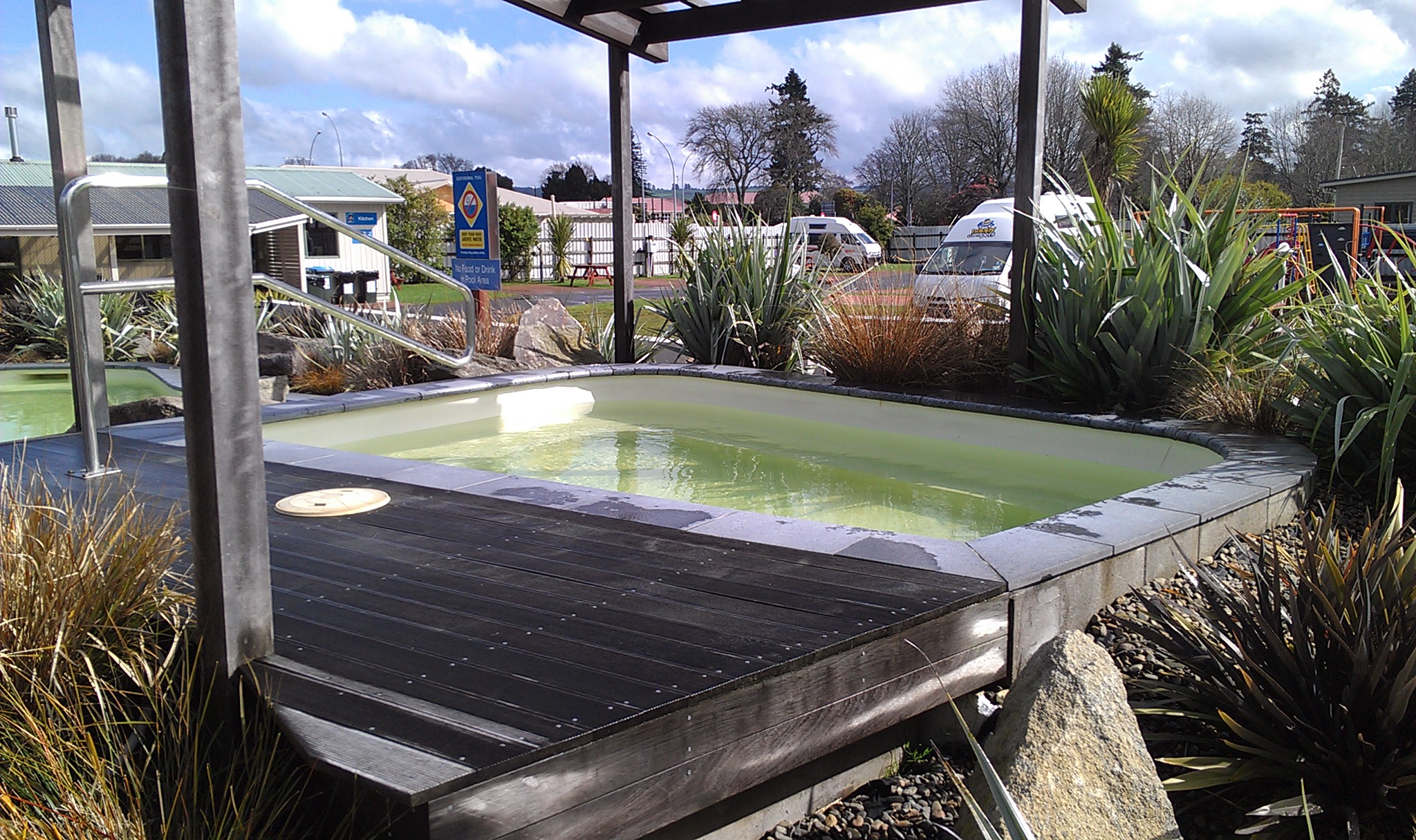 到了以溫泉著名的羅托魯瓦,連露營區都有附設的溫泉。有兩個池子,一個是38度,一個是40度。不過,水溫基本上僅供參考,這邊的溫泉並不像日本台灣一樣以高熱著稱。