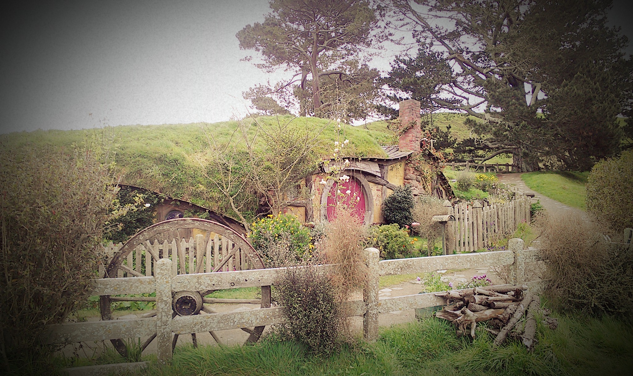 拍攝地點是一個丘陵,哈比小屋在蓋在一個一個山頭上。小屋有兩種,小的給 Gandalf 當背景,大的給哈比人當背景。門裡頭都沒有東西,除了 Bilbo家以外。整個拍攝場景主要是圍繞著一個小湖的丘陵地帶,最高的地方就是 Bilbo 家,活了幾百歲的人瑞當然住的是全村最豪華的。