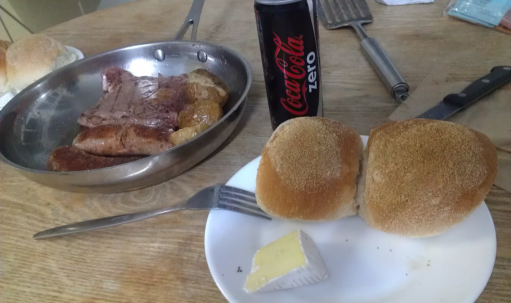 快要結束旅程了,今天的晚餐以消耗存糧為主。我把最後一塊安格斯、剩下的香腸、馬鈴薯煎了。烤箱有點壞了,其他旅客建議用他們附設的 BBQ Machine (有點像鬆餅機)來煎牛排跟香腸,所以竟然讓我們煎出了 BBQ 的條紋哩。