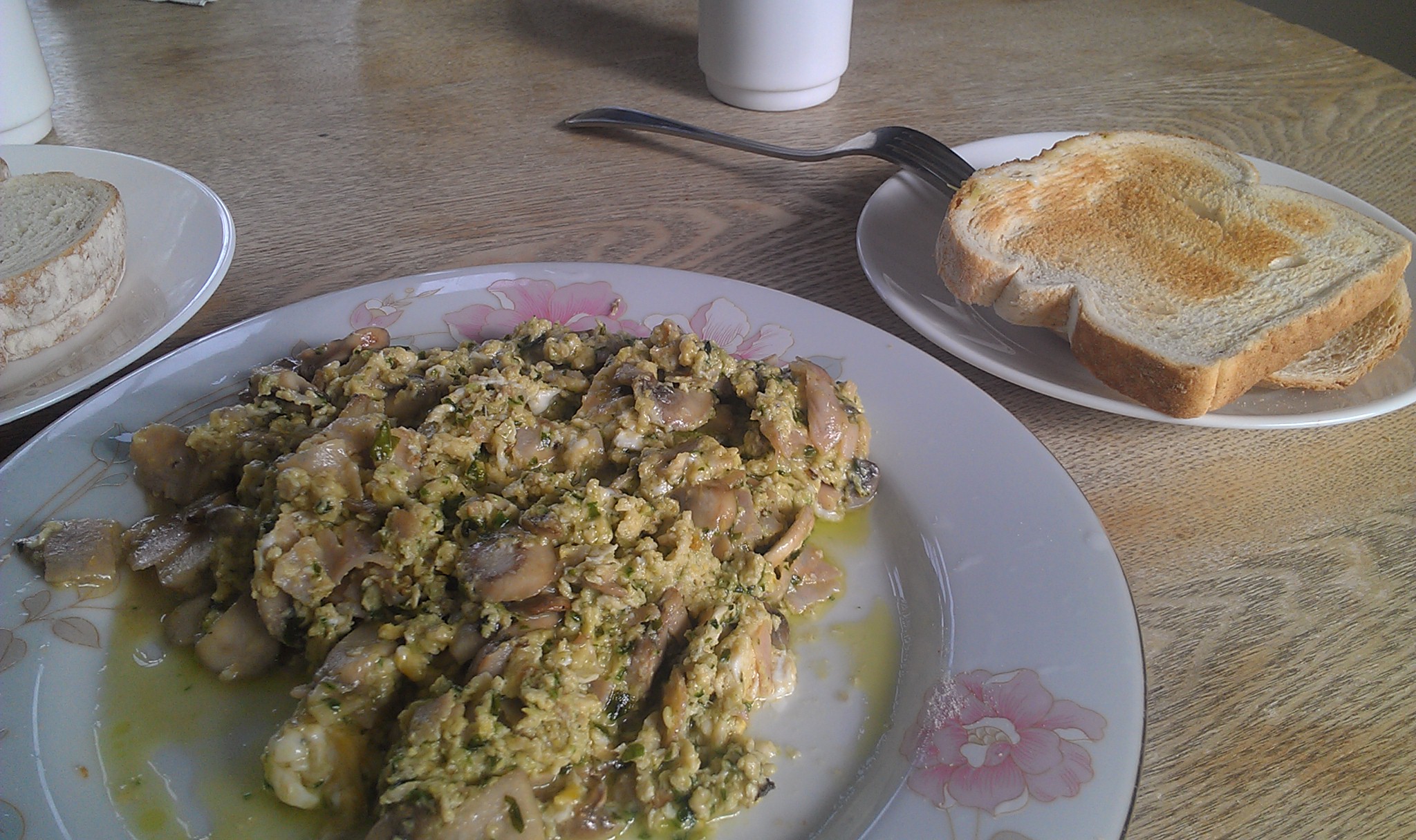 隔天早餐,把剩下的 Pesto、蘑菇、火腿拿來炒蛋。我也覺得賣相不佳,但是吃起來很不錯。