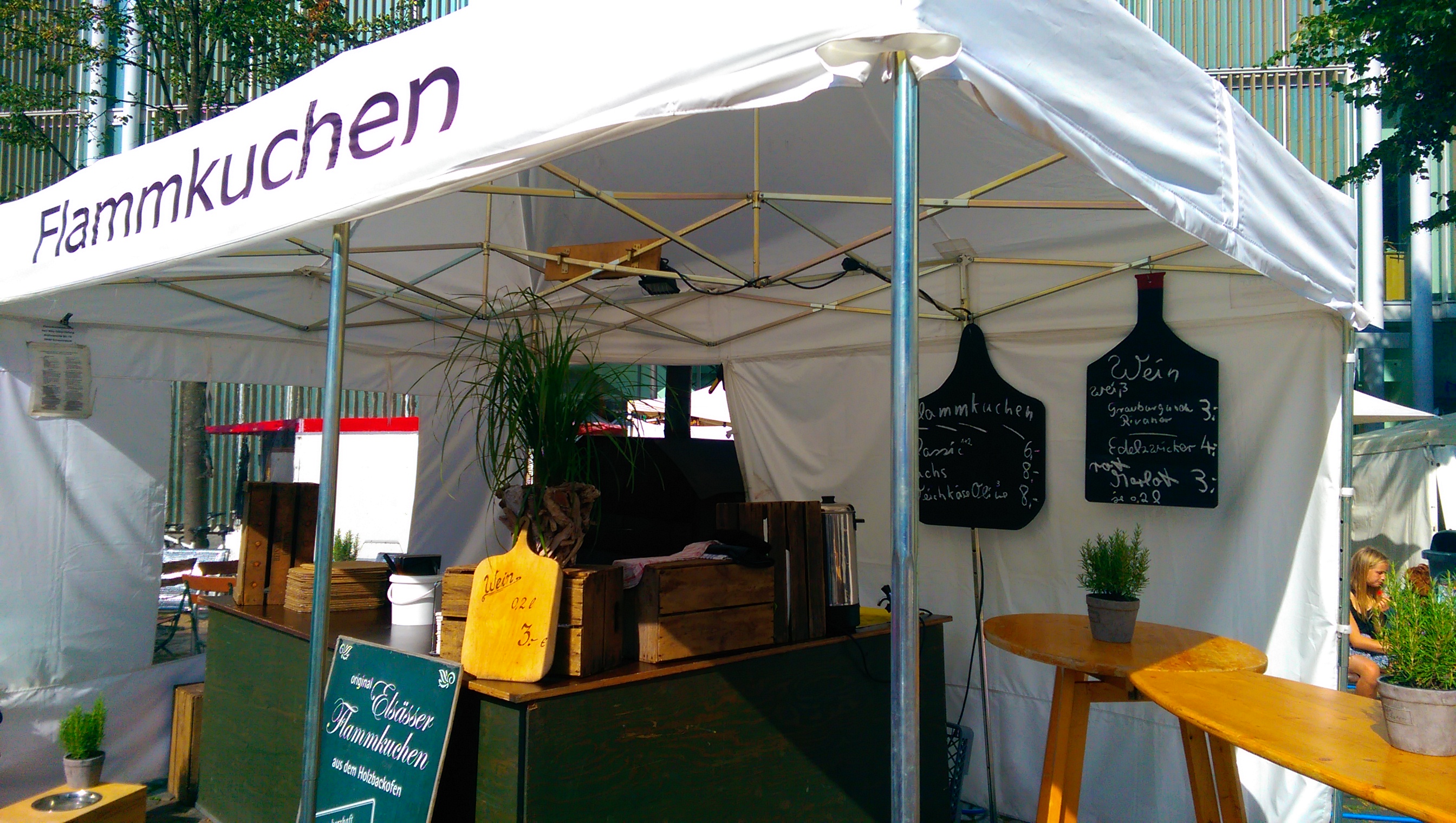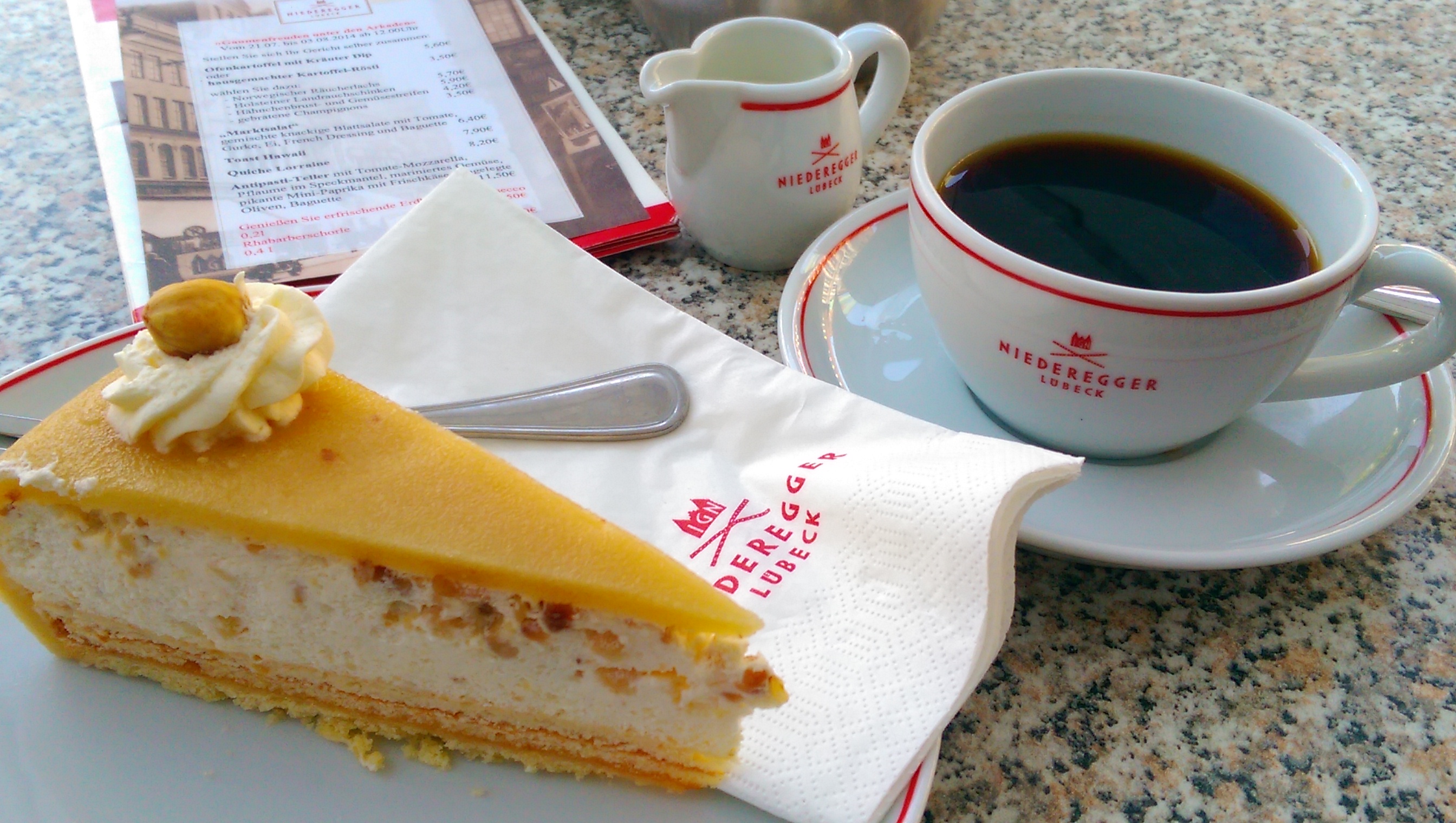 市政廳的前面已經有這著市集的攤位,這也是夏日德國旅館的不敗方程式之一,車站Haptbohnhof旁必有老城區Altstadt,老城區Altstadt必有市政廳Rathaus,市政廳Rathaus旁必有市集Marketplatz,去市集就對了。我相中了火焰煎餅,決定到時候再回來吃。這邊也必去杏仁糖店Niederegger,我在這邊吃了杏仁蛋糕跟咖啡,還買杏仁巧克力,雖然後來發現法蘭克福機場也有,但是機場的價格比較高。