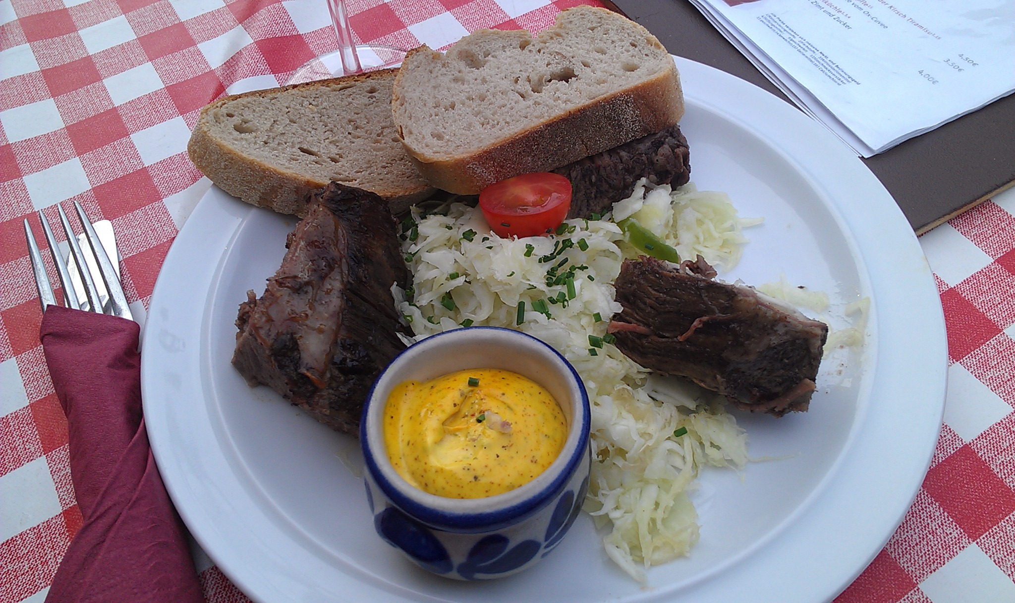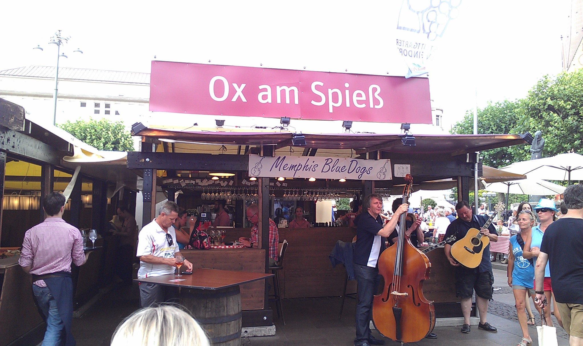 當天市政廳廣場也有市集(德國城鎮不敗方程式),主題是斯圖加特的酒商,不只賣酒,也賣吃的。我選了一下牛排店,配了一杯紅酒,十幾塊歐元而已。