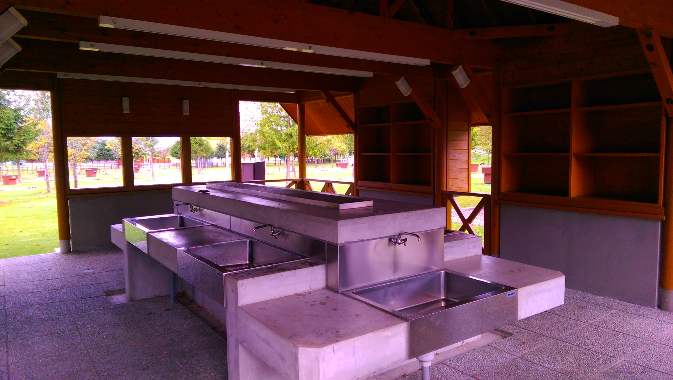 紐西蘭露營車很流行,雖然車上有簡單的廚房,但是大多數的人還是會利用營地的廚房,裡面電爐/微波爐/烤箱一應俱全。日本的廚房比較簡單,只有洗切菜跟BBQ。我們這次沒有看到日本露營客使用BBQ,甚至我們根本沒看到他們在做菜,大家的客廳帳(很多人甚至沒有客廳帳)最多就是煮水。這麼多天下來,廚房桌跟焚火台只有看過一次。