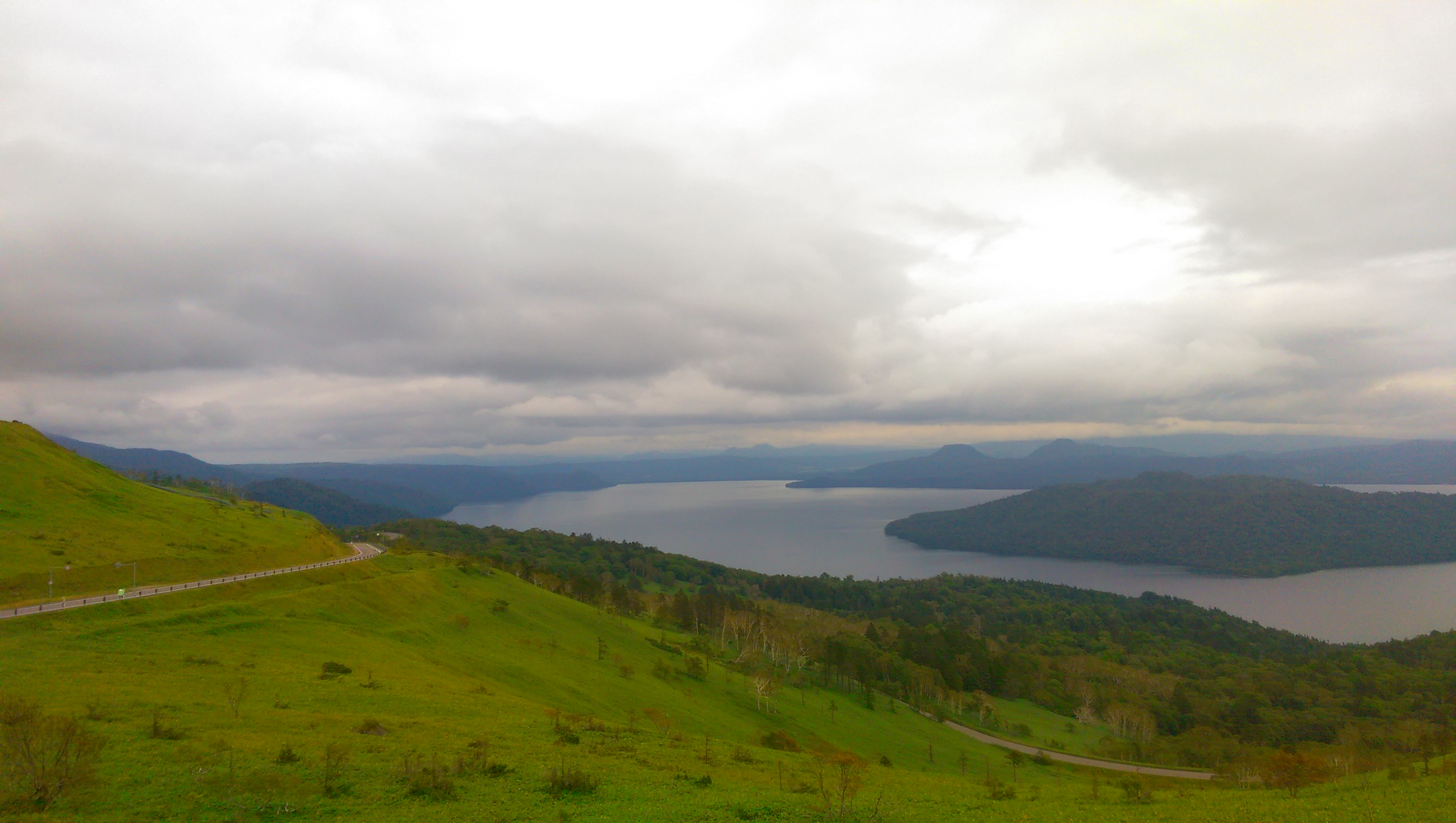 往摩周湖的路上,地勢慢慢地變高,到了最高點,便是美幌峠道之驛。這個道之驛賣的東西比較一般,但是停車場跟附近的公園都有極佳的視野可以俯瞰摩周湖。