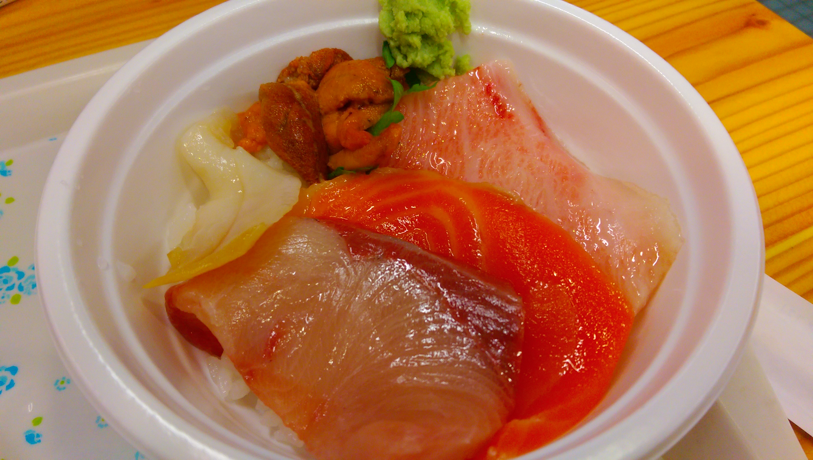 幸運的是,這招可行,到達和商市場時,幾乎已經沒有雨了。和商市場的海鮮丼(勝手丼)超有名,首先是要找賣飯的商家買飯,然後去賣生魚片的商家把生魚片放上去。這個季節,很意外的還是有黑鮪魚中腹,我們很敗家地來了一片,然後選了鮭魚海膽等其他海鮮。