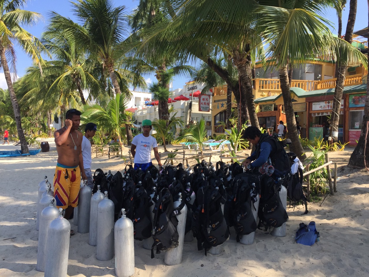 長灘島不是潛水界常討論的地方,但是 PADI 的店超級多,海灘附近超過十家。我們選擇了瑪莉歐 MARIO潛水店,這家是台灣人開的,老闆就叫 Mario (或小蔡)。說真的,休閒潛水 Fun Dive不是他們的主力營業項目,他們大部分客人是體驗潛水 Discovery Dive,生意好時可以將近100位學生(亦即需要50人次的潛水長)。也因此,他們非常注重安全,C-Card一定要攜帶,OW程度不會帶去太深的地方,下水前的裝備檢查很確實,還會借潛水錶給客人(真的很棒想說三次)。