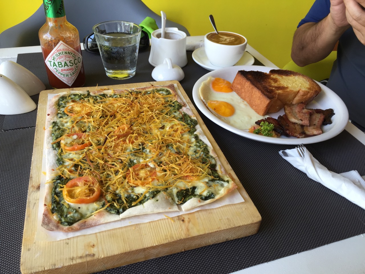 (1) 我們自行開發了這家在 Travel Advisor 評價頗高的早午餐店 the sunny side cafe,吃了雙蛋早午餐以及披薩。這邊的披薩很好吃,我們一致認為這家是我們去過最好吃的家,而這家竟然沒有任何部落客寫過。我猜原因是這家靠近S3,距離大家熟悉的S2與DMall比較遠的關係。