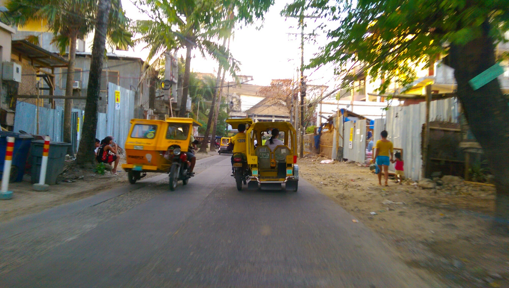 海灘只能步行,坐車要到大街上。說是大街,其實是一個很小很破舊的兩線道,跟海灘上的環境差很多。大街與海灘平行,這裡長灘島實現了未來世界大眾運輸的可能。除了旅館旅行社的車輛外,這邊大量使用了摩托車外掛的三輪車,外地人收$60(包車概念)披索,本地人收$10(合乘概念)披索。這些三輪車多到就像捷運一樣!