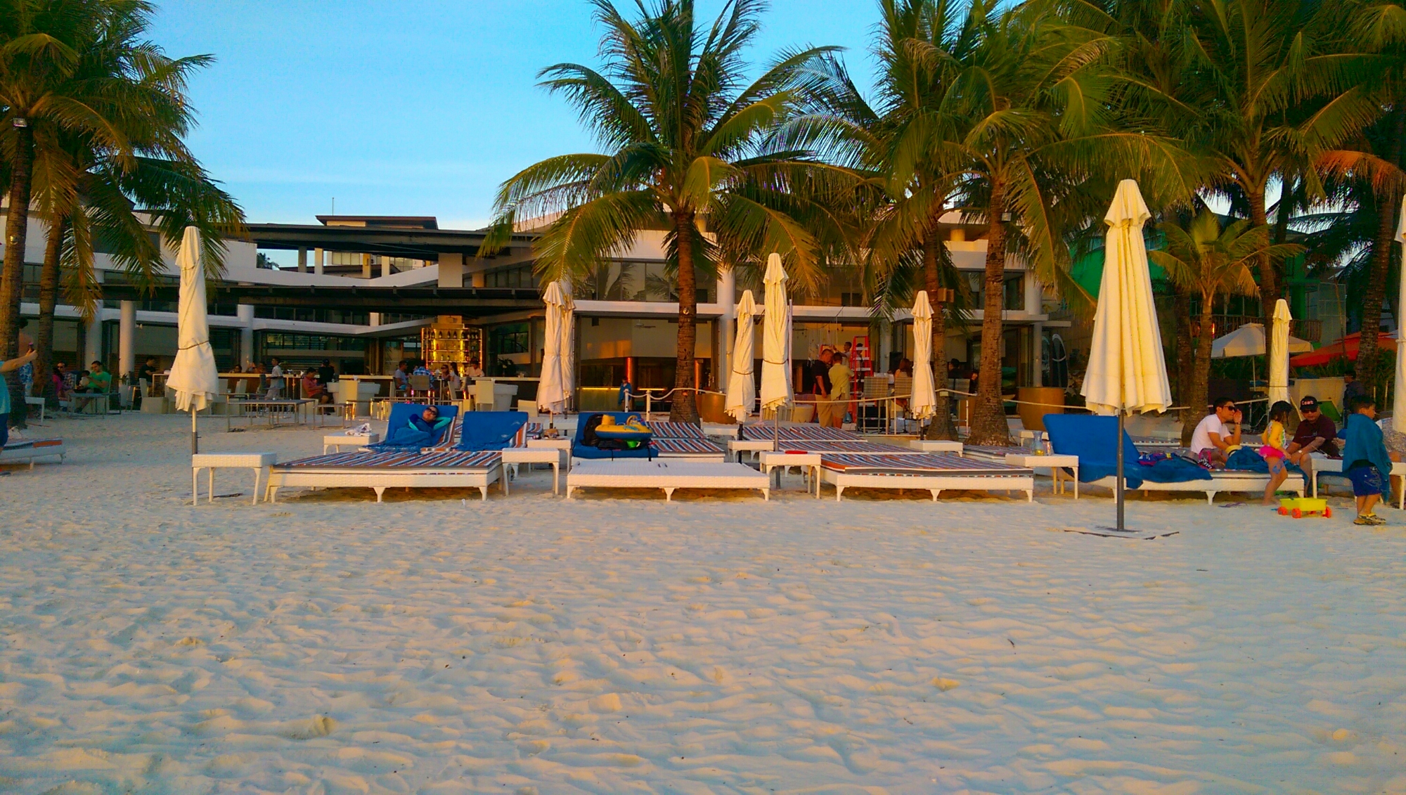 長灘島顧名思義,有個很長的海灘,應該有幾公里這麼長,幾乎所有的旅館餐廳都在這條沙灘上。所有的海灘都是公共的,大部分的旅館,都是短邊對海灘,也就是說,旅館的游泳池是私有的,但是都有前往公共沙灘的通道。我們旅館正對海灘的那面大概也只能放五六張躺椅。