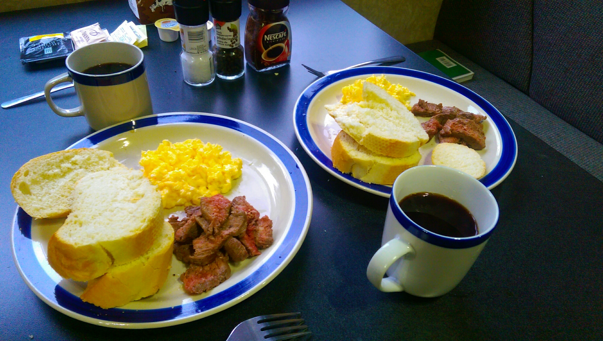 今天早餐是滑蛋 /麵包/ 還有昨天吃剩的牛排,滑蛋與牛排大家都喜歡,不過,麵包冷冷吃有點掃興。其實租車公司也有提供烤麵包機,但是很可惜沒有租用 (這種溫度吃冷麵包實在有點難以適應 )。喝咖啡煮的水是用傳統的嘟嘟壺,這種燒水壺已經十幾年沒用過了。窗外自然成為一幅圖畫。