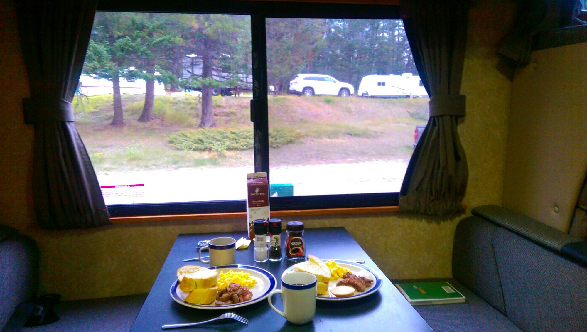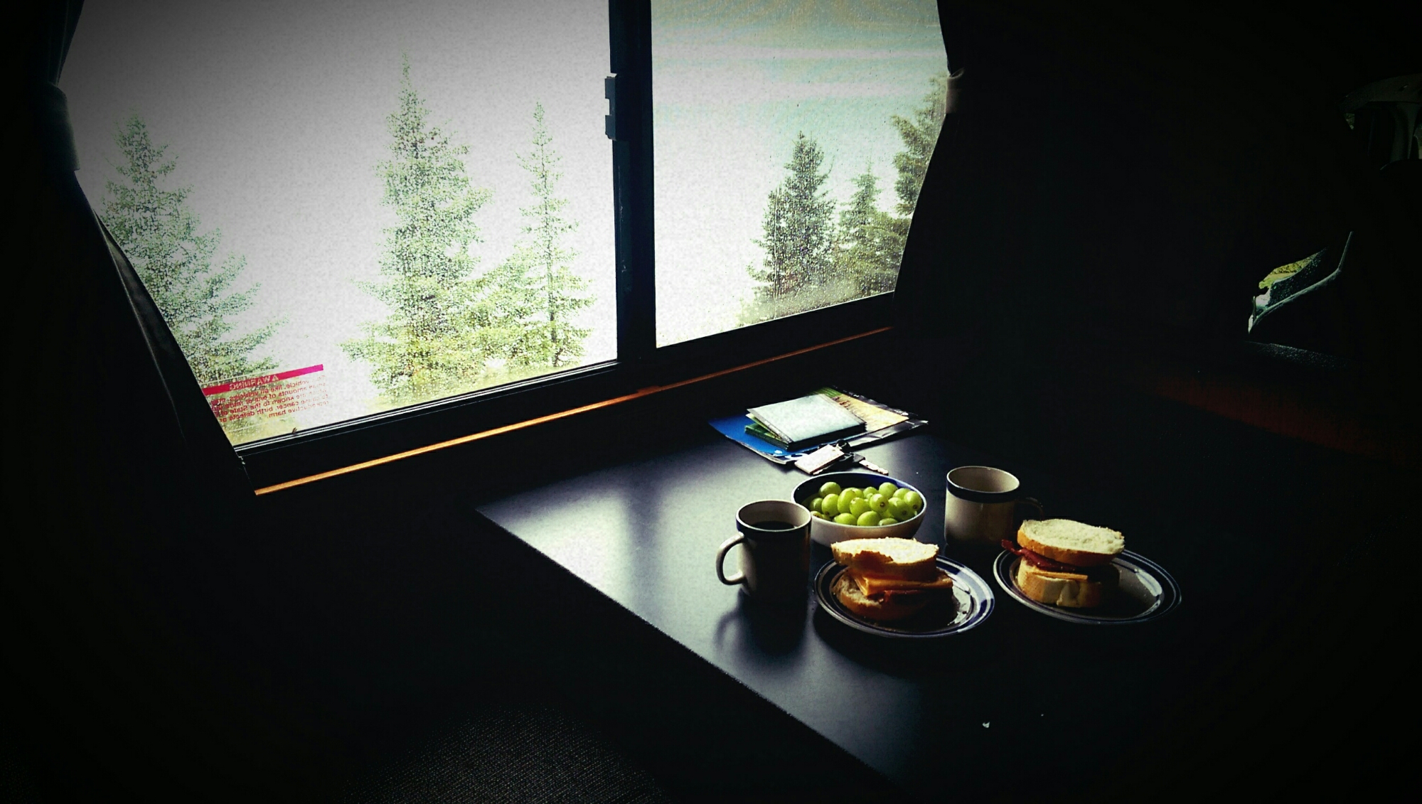 這一停就發現真是停對了,我們基本上是把露營車的側邊車窗面對湖,雖然下雨,窗外的美景還是盡收眼底。我決定立馬安營紮寨,開始做午飯。其實,說午飯其實就是用牛肉火腿與起司包個三明治,搭配無子葡萄。這個風景簡直是加分中的加分。