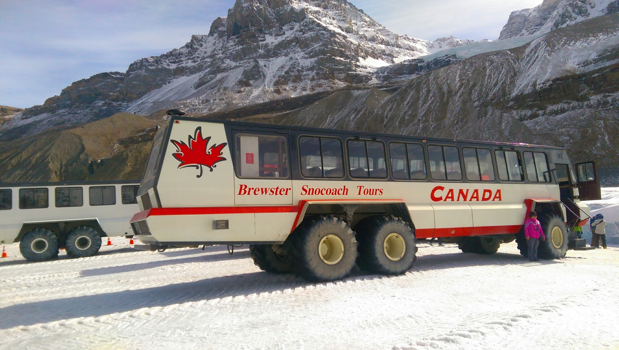 今天的行程是走回露薏絲湖,主要就是看著名的哥倫比亞冰原。搭乘冰原探險車 (Snow Coach)必須要先搭接駁車到冰原旁,再搭特製的大輪雪地車前往。