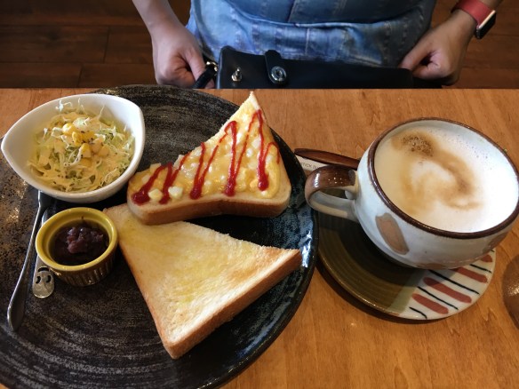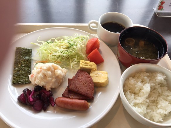 住宿 沖繩Nahana Spa飯店/早餐 甘味処万丸:這一家旅館是在單軌電車縣政府站的旁邊,不過沒有附早餐。網路上查了一下,附近有網友提到一家早餐店,標榜買咖啡送早餐,咖啡的價格是日幣$380,然後店家會送土司麵包沙拉以及紅豆果醬。出乎意料的是,他的咖啡非常的好喝,至於土司麵包熱熱的烤出來,還是很受小朋友的喜歡。