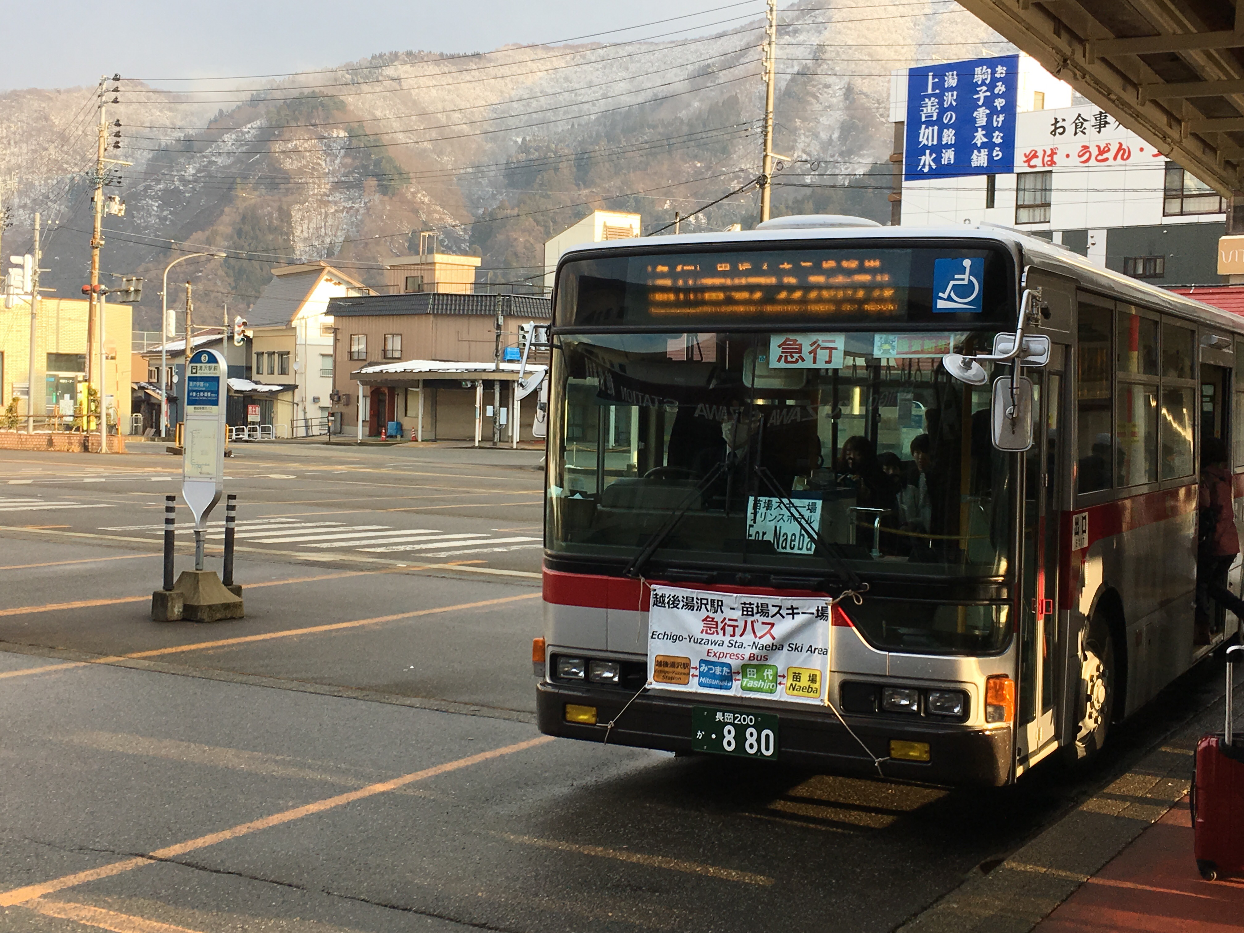 從越後湯澤站的東口搭急行巴士(票價660日幣),會陸續抵達三俣Mitsumata、田代Tashiro、以及苗場Naeba三個滑雪場。這個三個滑雪場有時又稱為苗場山滑雪場,中間有日本最長的纜車Dragon連結苗場與田代。是台灣滑雪客非常愛去的地方。下面就是越後湯澤站東口的巴士,建議預留一點時間因為座位有限,開車前才到幾乎就是要站著了。