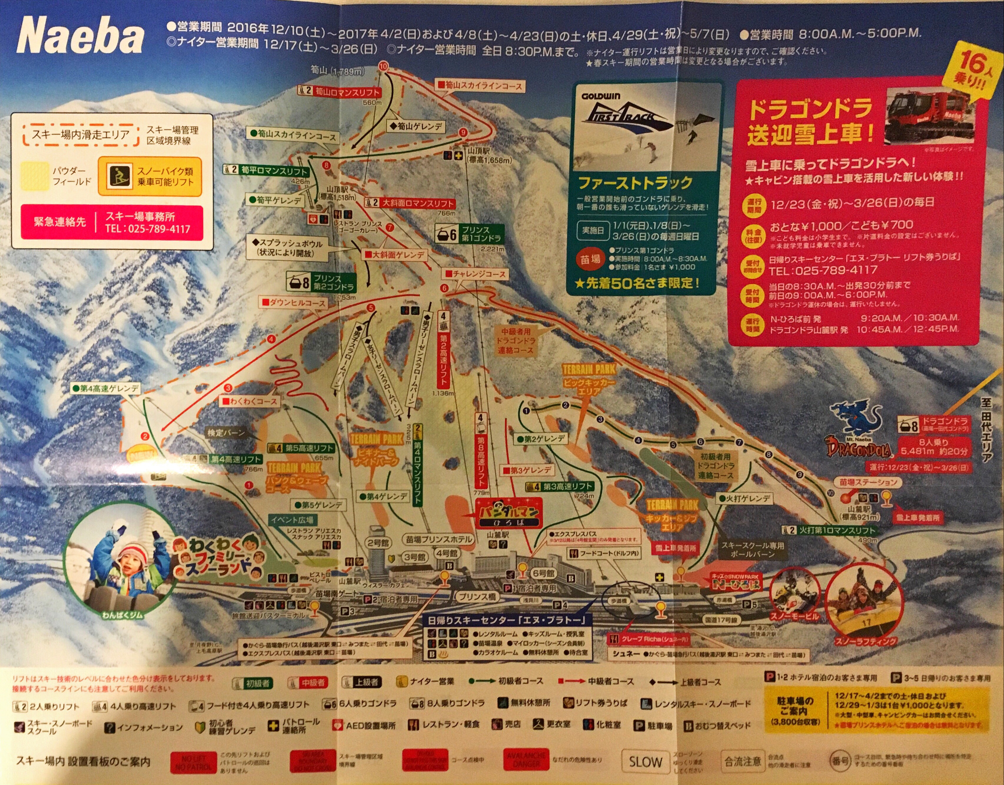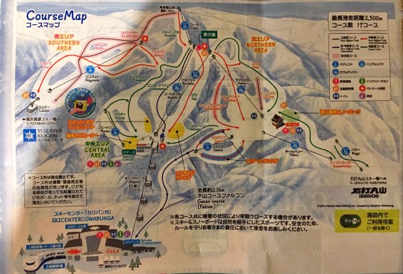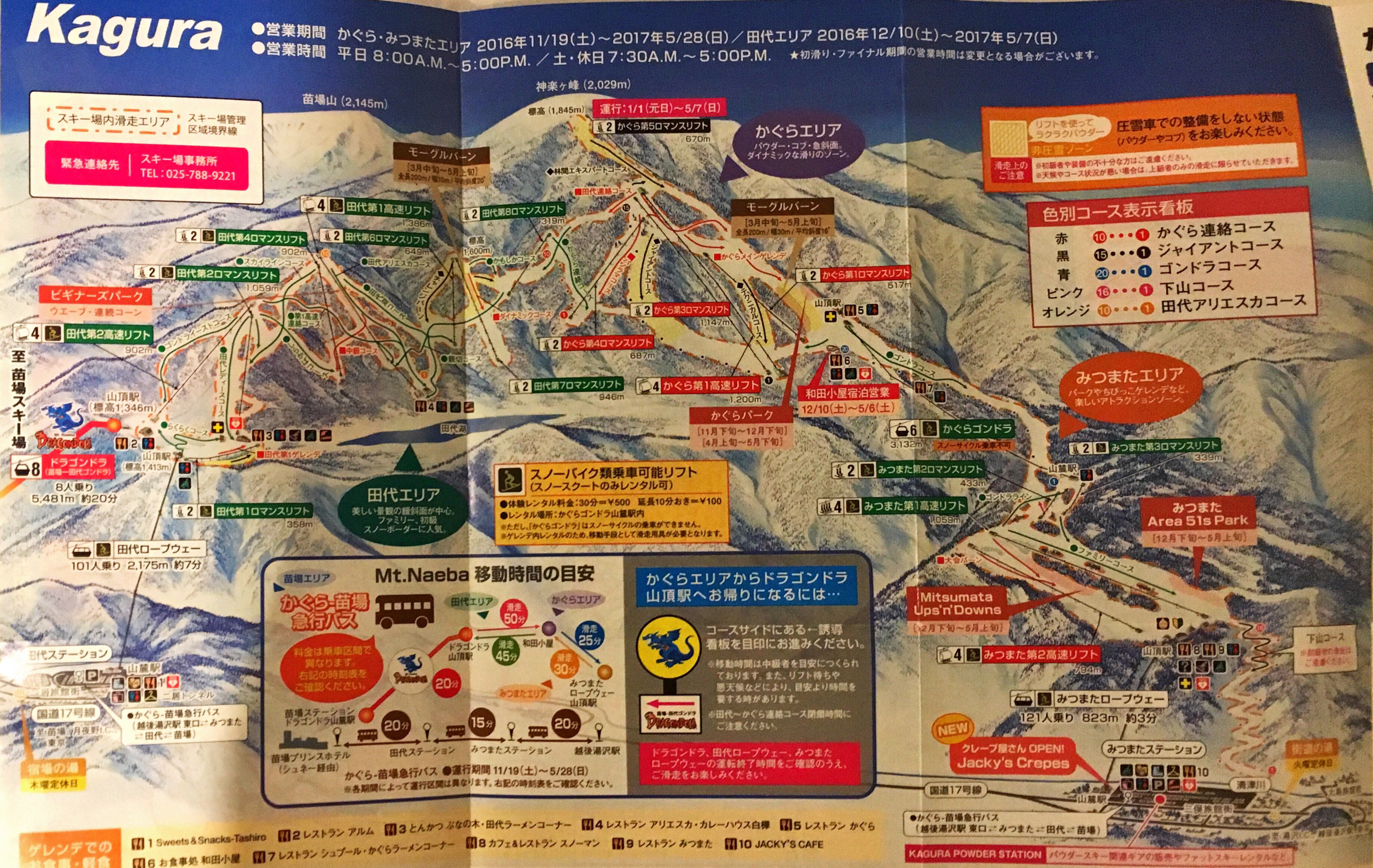 最經典的行程,就是由三俣、經過田代,一路滑到苗場,或反過來從苗場滑過去。我們選擇在苗場開始,所以是先搭Lift,從田代聯絡道開始滑,然後從田代一路滑到三俣滑雪場,再滑回來。下面的兩張地圖,是可以由著名的 Dragon Gondola連接的。