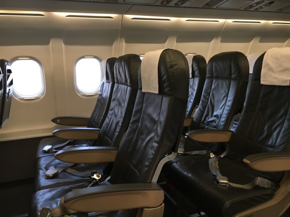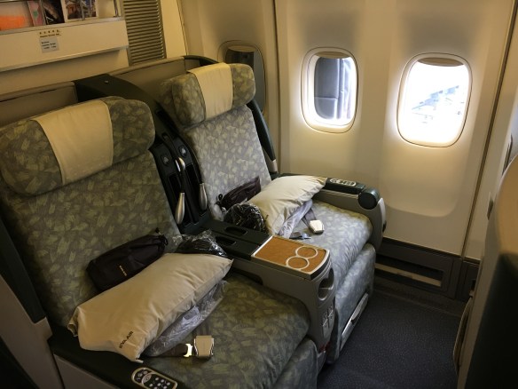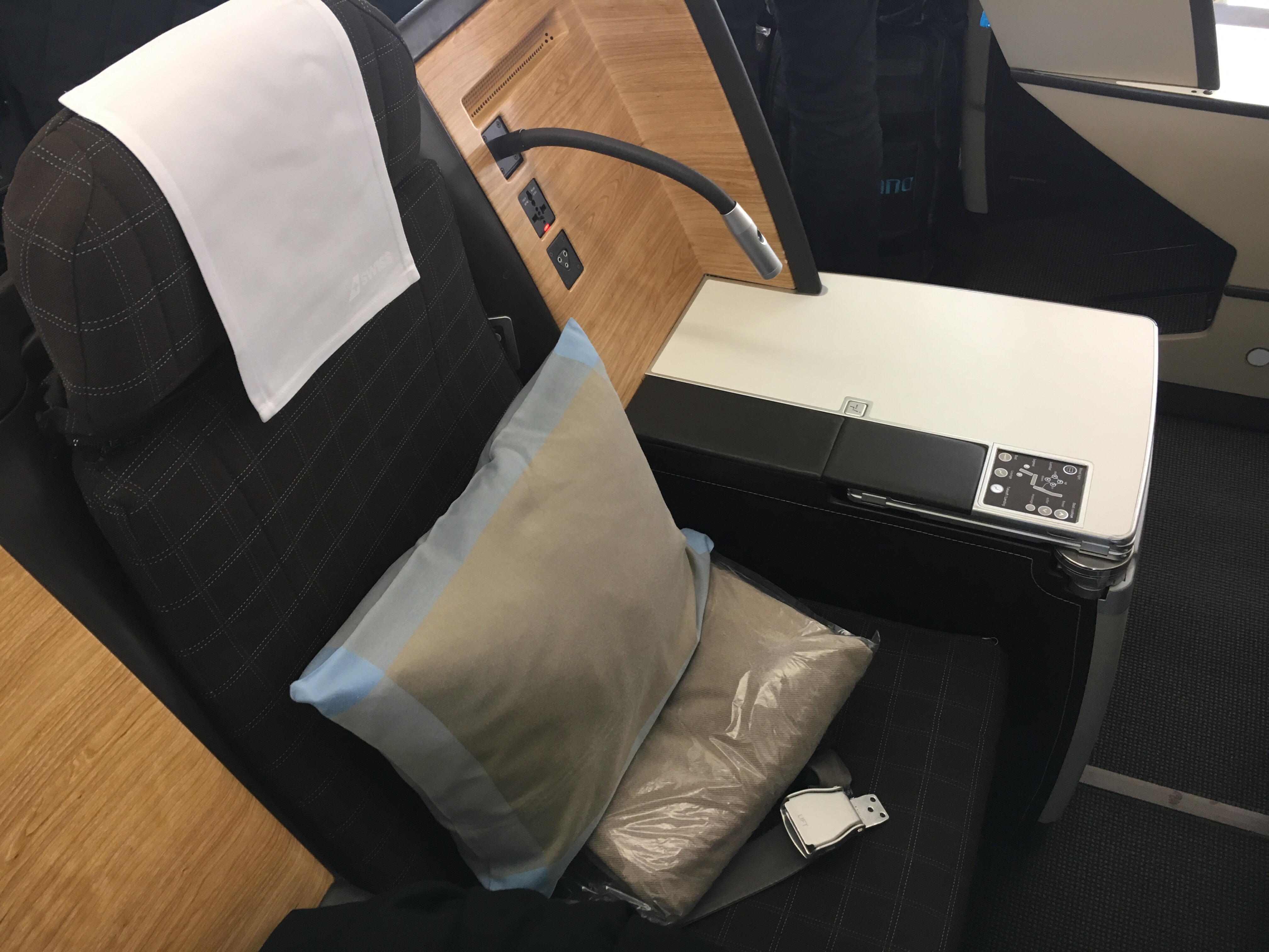 座位是2-3,座位根本與經濟艙是一樣的。差別就是頭頂上的行李架註明商務艙專用,以及空姐送來的水跟報紙(光問我要不要報紙又用德法英三國語言問了三次,很忙碌)。