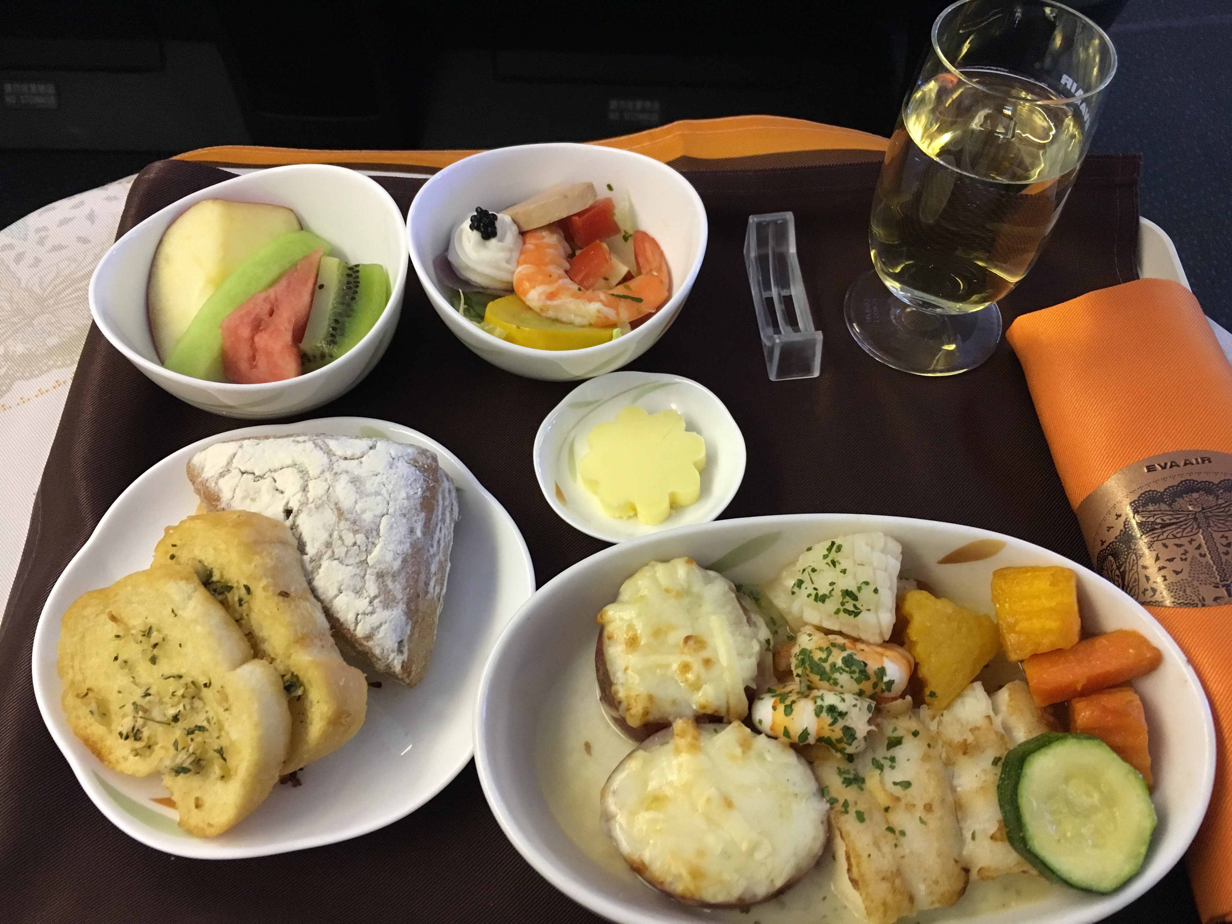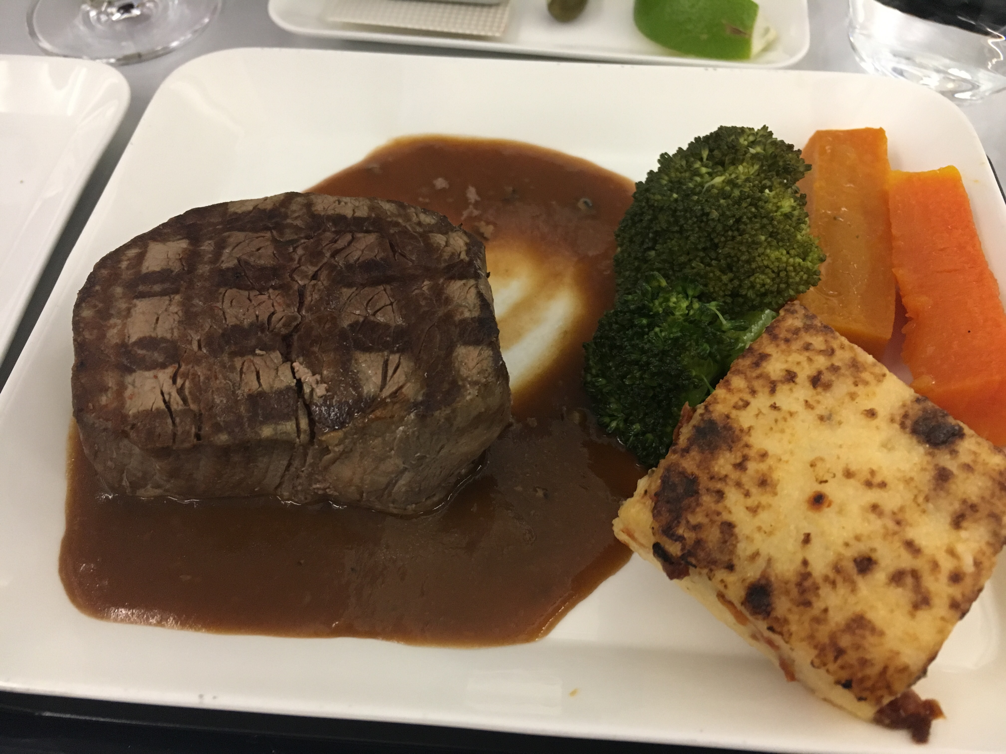 餐點有牛腩跟海鮮,因為想喝紐西蘭白酒選了海鮮。餐點還不錯,魚子醬比想像份量少。飛行時間只有一個多小時,沒有什麼好挑剔的。