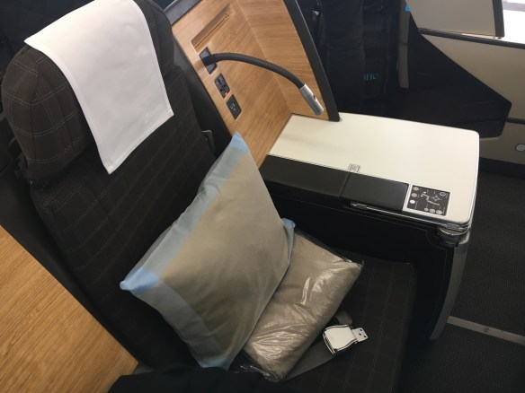 商務艙基本是全滿,我的區域是1-2-1的配置,不是魚骨型,正對機頭的設計。座位上比較有意思的設計是有很大扶手區,而且前後是交錯的,也就是我的扶手在左邊,我前座的就在右邊,而我左邊的旅客也在左邊。