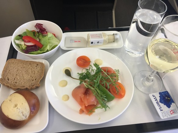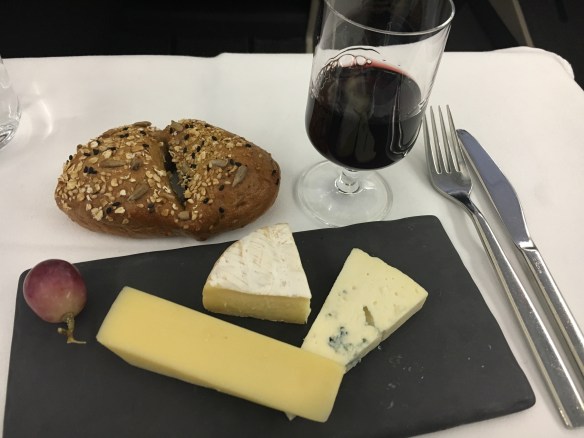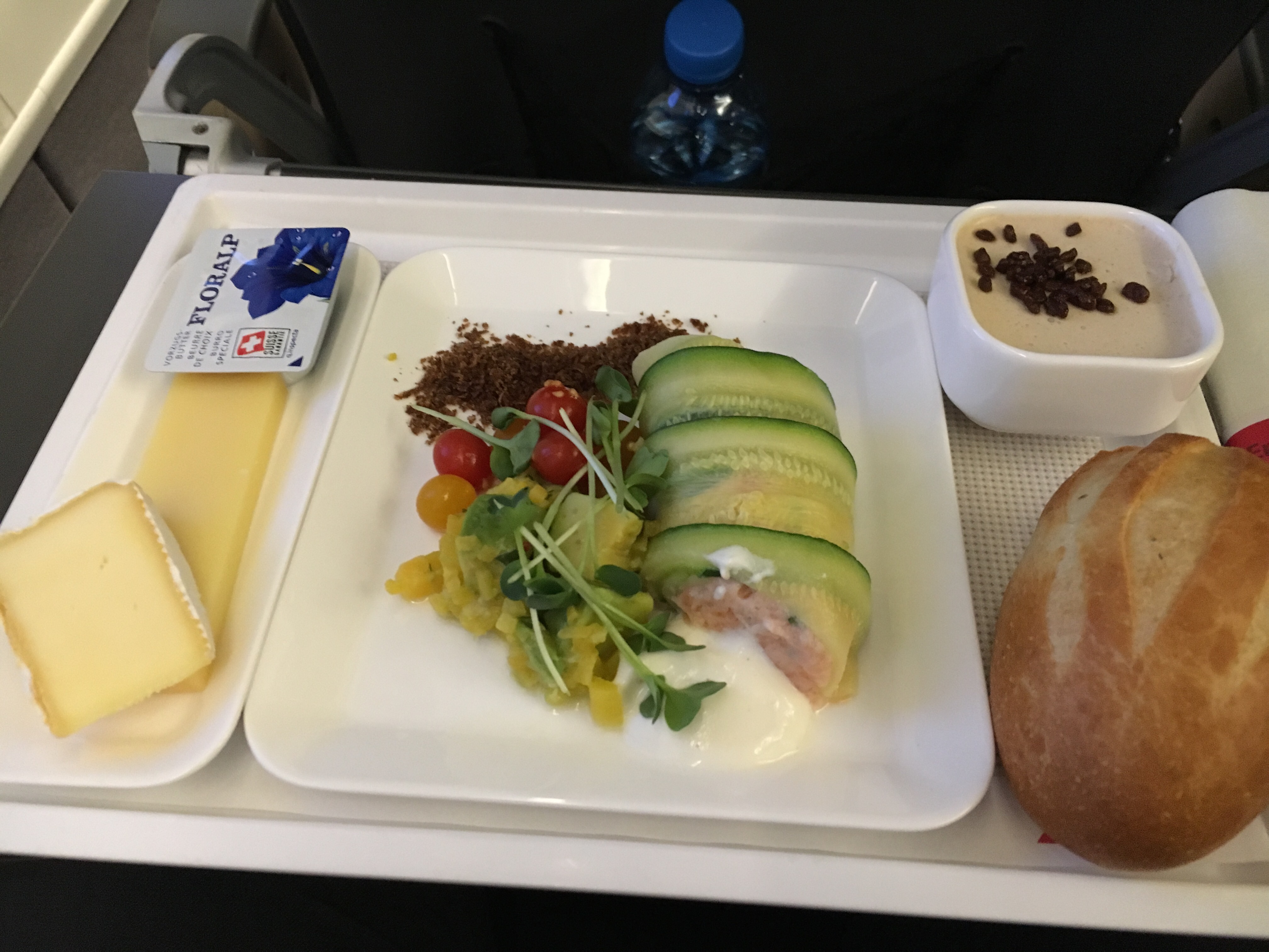 不過,機上餐點還是蠻好的。是起司盤,加上酪梨魚肉沙拉,配合上麵包與瑞士白酒,不知不覺又完食了。