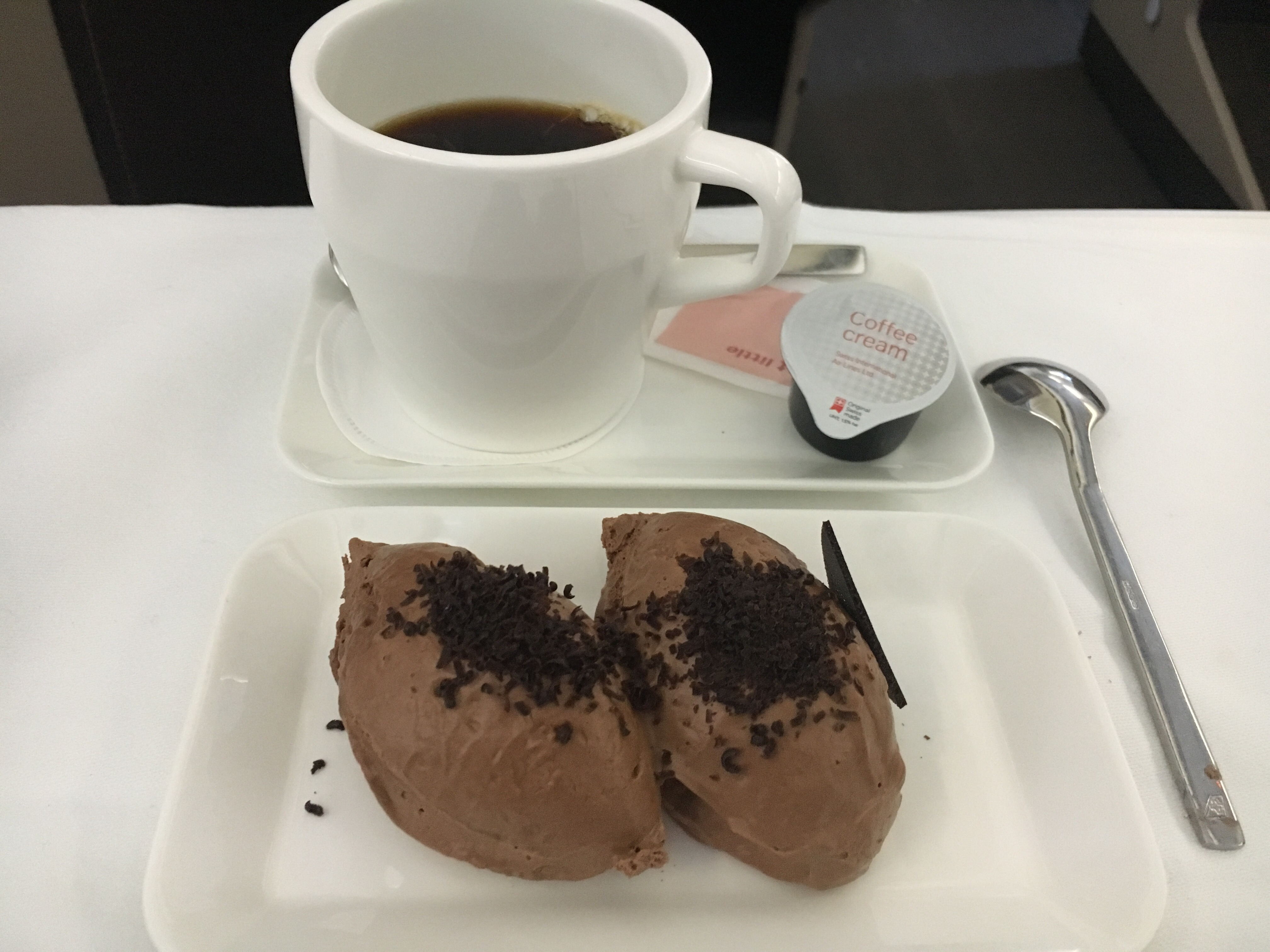 在第二餐之前,中間六七個小時的服務很好,看文件時點的飲料,送上來還多給過冰淇淋。零售吧(什麼?還吃的下!)有泡麵餅乾洋芋片康寶濃湯外,三明治也很優。這真的是歐美航空的優勢,人家廚房隨隨便便都買的到帕瑪森火腿,很難不好吃。