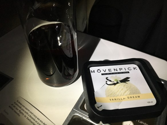 從迎賓酒,依序是堅果/飲料,鮭魚/生牛肉沙拉(我配紐西蘭白酒 Sauvignon Blanc)、主菜(我選牛排、配瑞士紅酒Pinot)、餐後起司盤(配紅甜酒),加上巧克力慕斯與巧克力。(欸,喝這麼多酒說好要工作的計畫呢)。