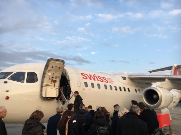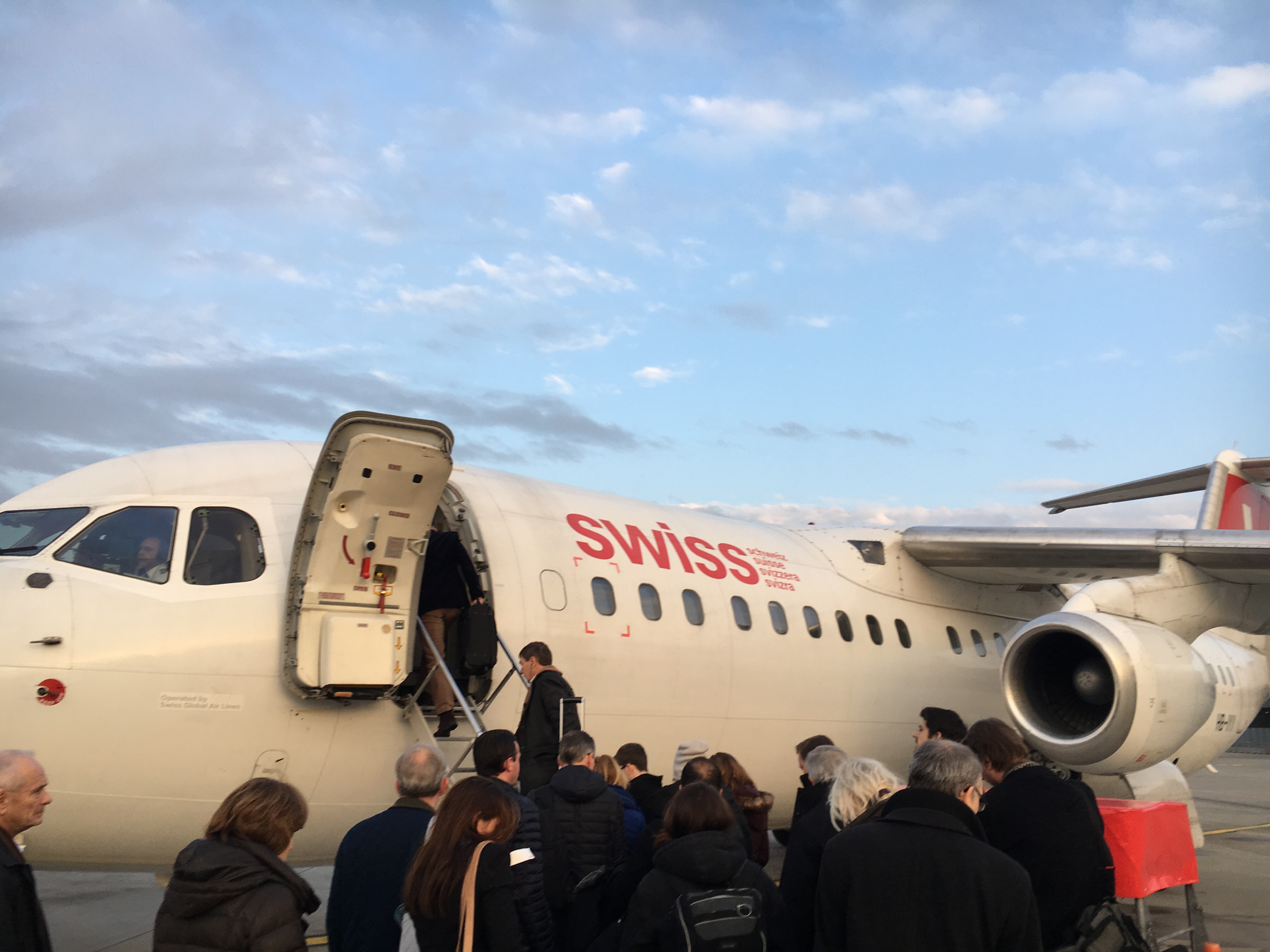 距離很近,執飛的是很小的噴射機。這麼小的飛機只能搭接駁車沒有空橋。在尖峰時間候機室也是滿滿都是人,等著飛往斯圖加特、盧森堡、佛羅倫斯的地點。
