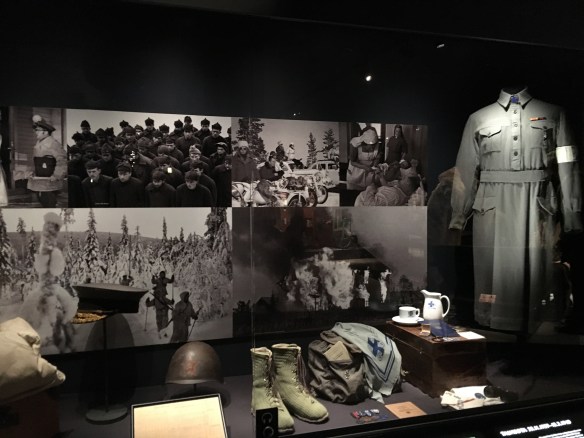我注意到館內二次大戰期間芬蘭歷史的部分,後來還上網查了一下維基百科。在二次大戰期間,蘇俄曾經入侵芬蘭,在1940年打了一場著名的冬季戰爭。蘇俄動員了將近百萬的士兵,對抗兵力可能只有10分之一的芬蘭軍隊。那個冬天芬蘭的氣溫,降到了零下30幾度,蘇俄的坦克部隊在森林裡幾乎寸步難行,成為芬蘭游擊部隊狙擊的對象。