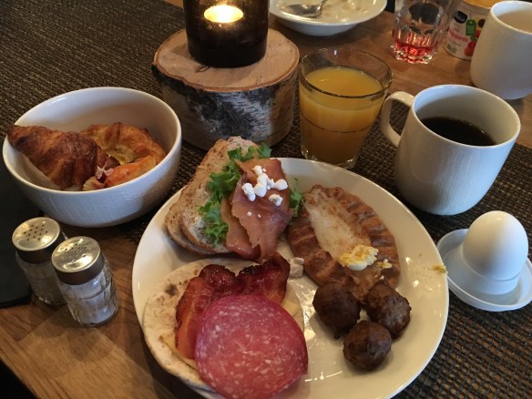 早餐很不錯,美式的部分有炒蛋但很弱。歐式的部分就很強,起司麵包火腿優格等等都不錯。比較厲害的,是來自於北歐的食材,譬如說瑞典的Meatballs 、芬蘭的Karelian Pie( 派裡面包的是很像馬鈴薯口感的飯)、燻鮭魚等。