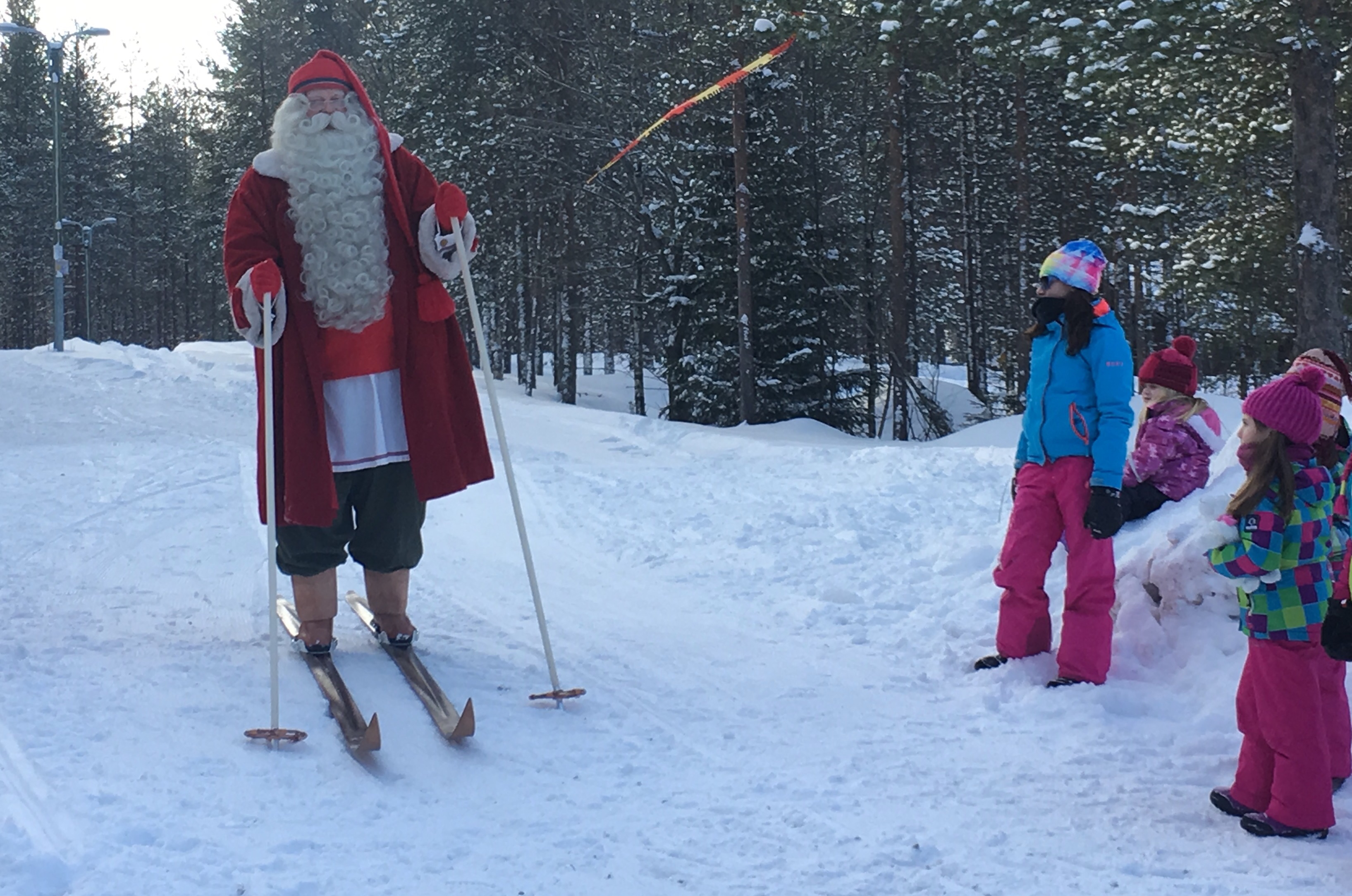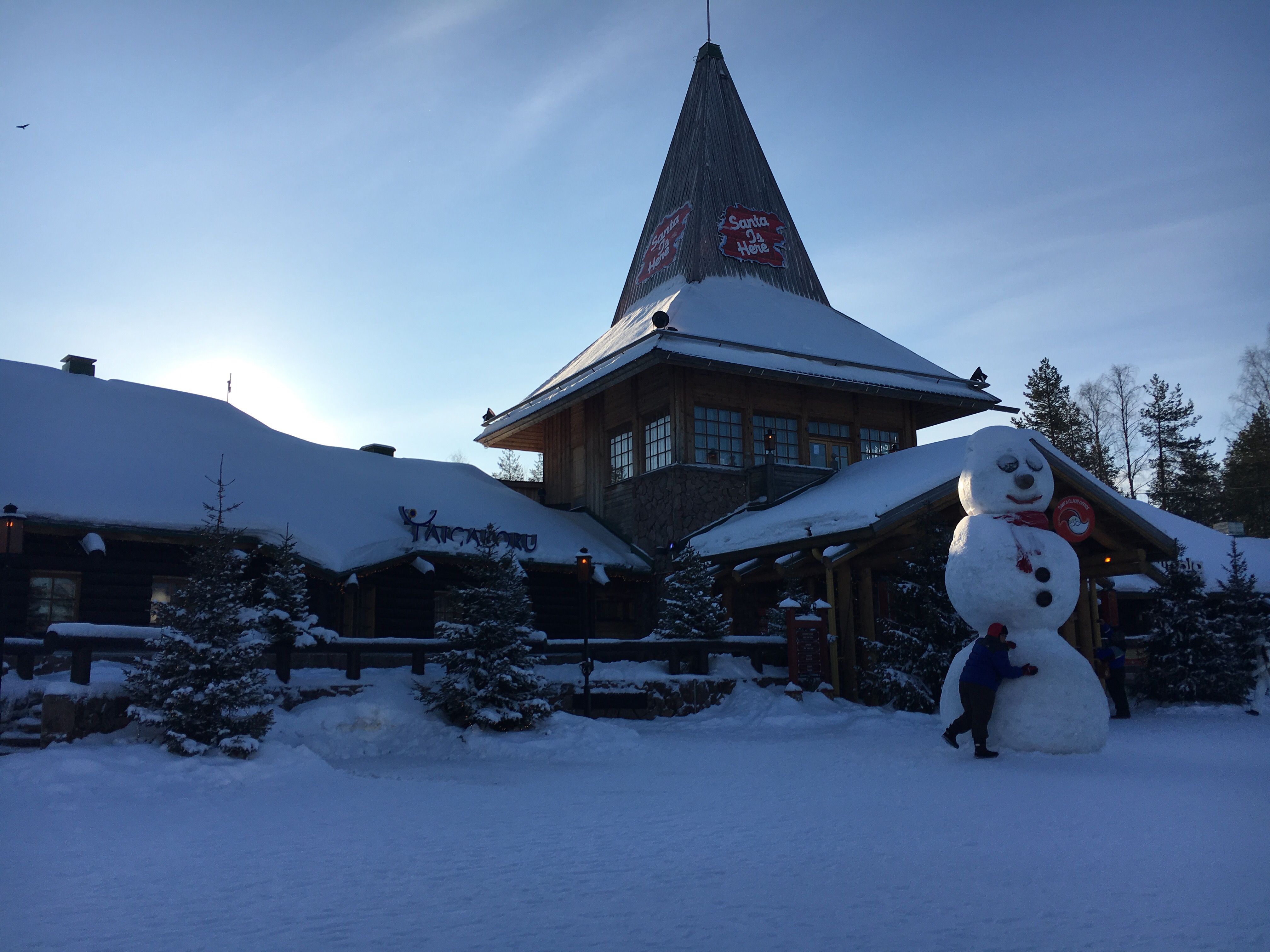 早餐後前往聖誕老人村,市區有公車可以直達。接近十一點(我們昨天很晚睡),聖誕老人村的「聖誕老人辦公樓」已經滿滿都是人,加上合照也不便宜,我們就放棄了。想不到,中午經過雪板區,聖誕老人正在拍滑雪板的公關照,很幸運(沒花錢)終於見到他的真面目。