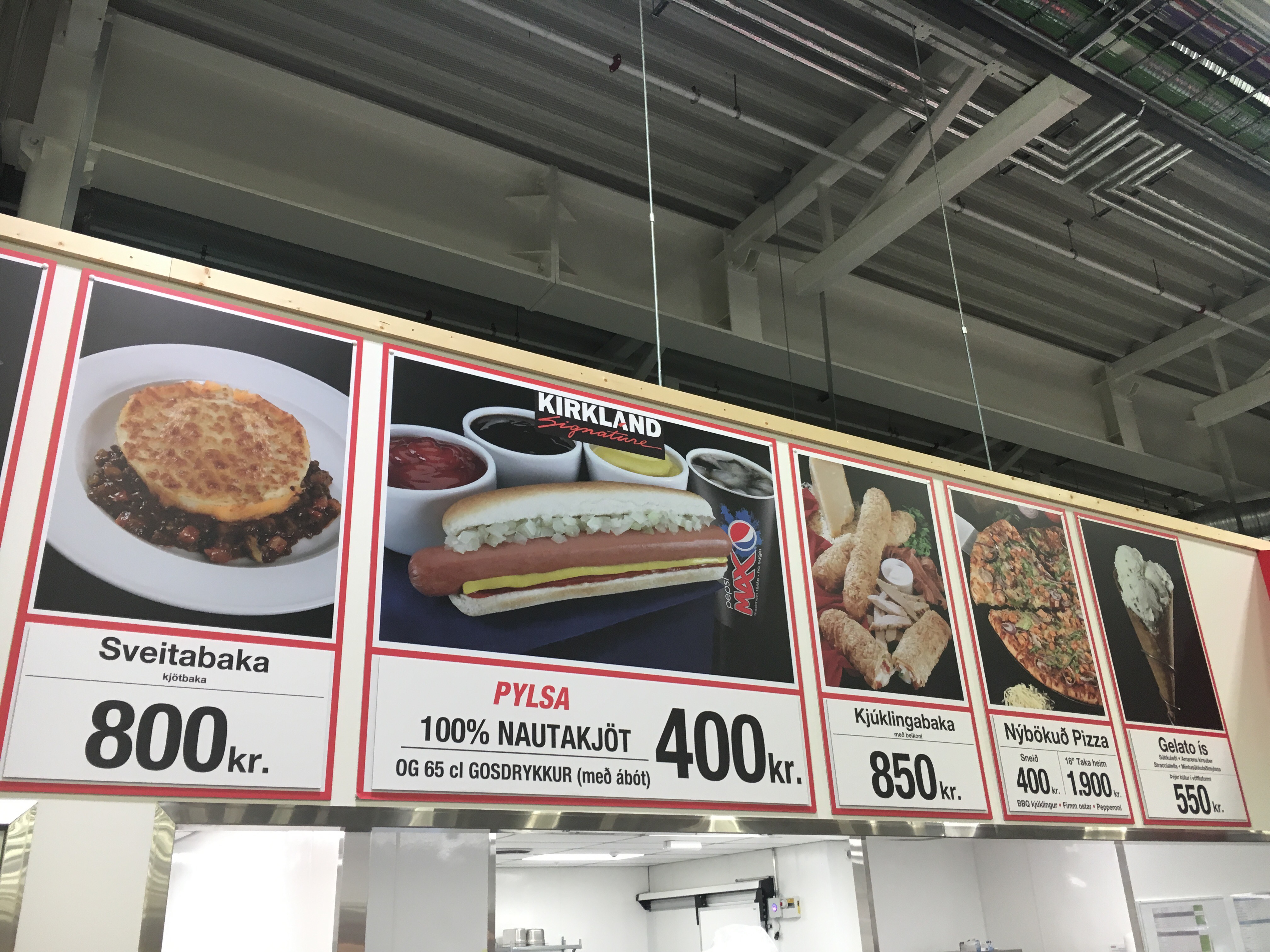 總的來說,好市多的牛奶應該是全冰島最便宜的,一瓶只要139克朗。我們也買到的600克朗的水果、900克朗的可頌,已經足夠吃三天份1100克朗的魚。不過這邊的雞蛋稍微貴了一些(台灣也是)。我們也試了一下好市多的熱食部。這邊主打菜色是400克朗的熱狗,加上飲料。