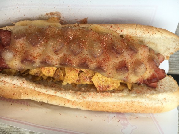 重點是,我們發現這邊有一家大排長龍的熱狗,我們也不禁點了一份來吃。跟BBP比,這邊的熱狗加了多力多滋,吃起來別有風味。如果是世界第一,這家應該有世界第二!
