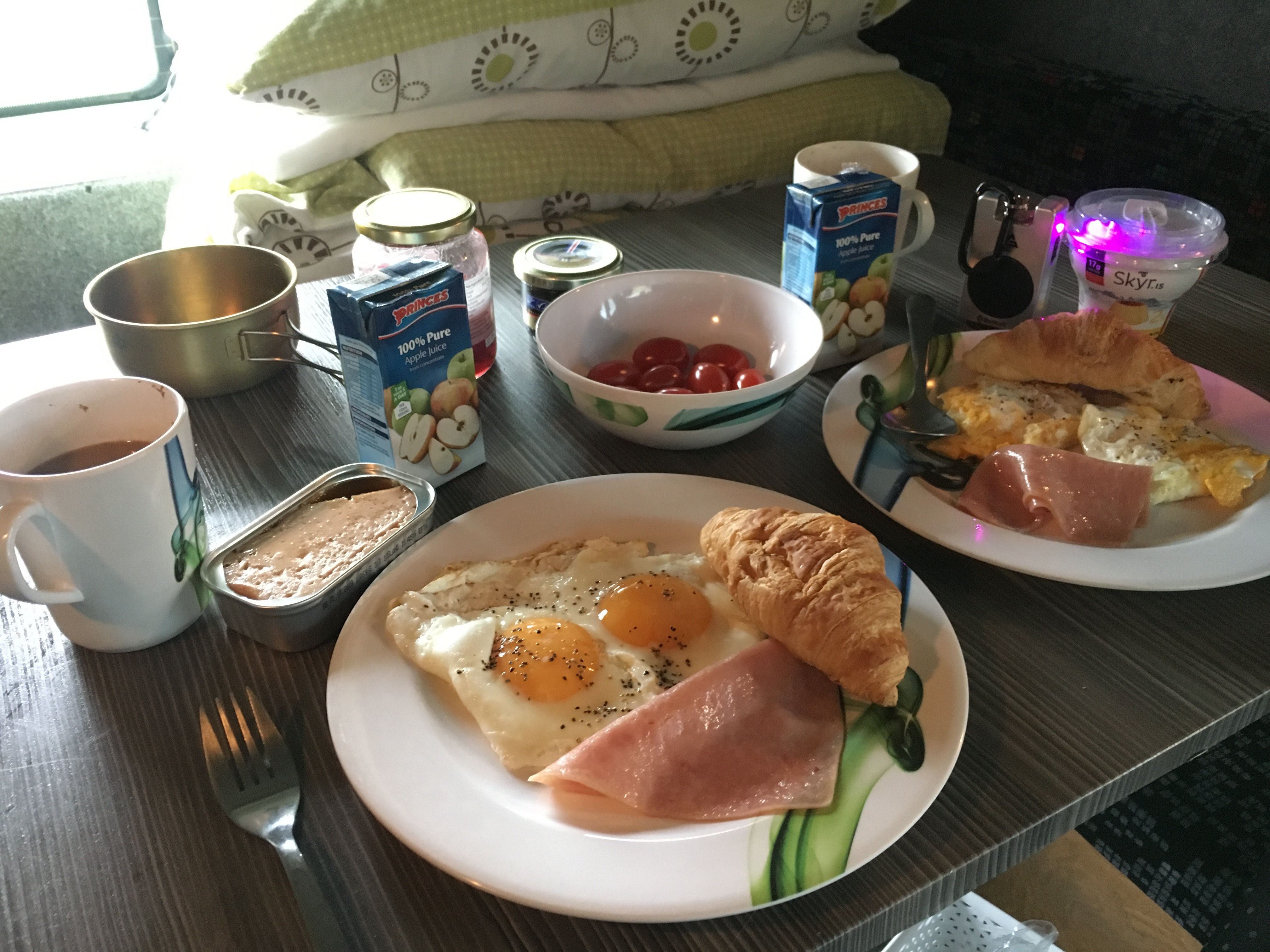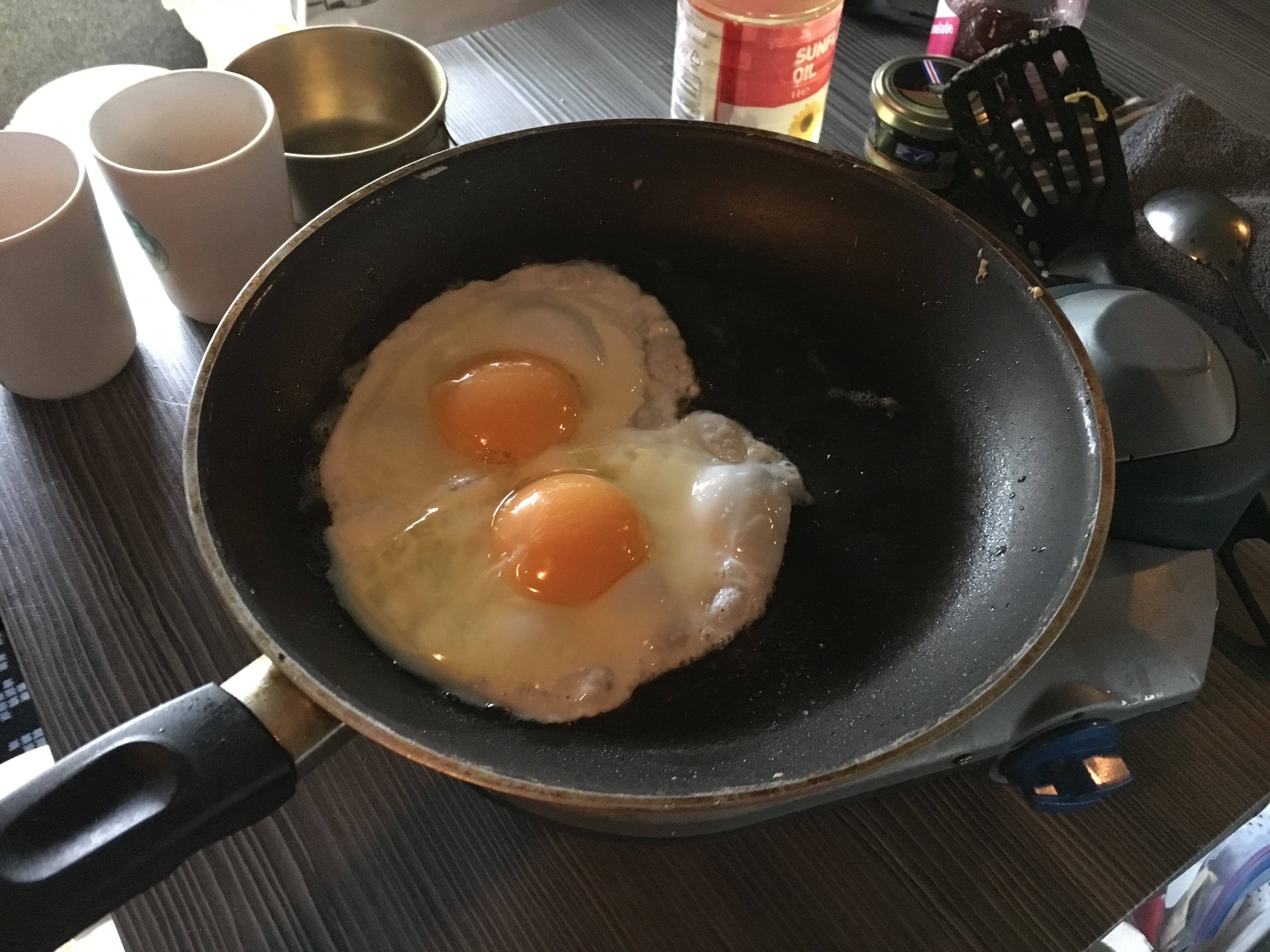 露營公司附的鍋子,是不沾鍋,所以煎荷包蛋還算可以控制。比較麻煩的是只有一個瓦斯爐,所以要先煮水來煮咖啡。可頌當然是塗點鵝肝醬與魚子醬。