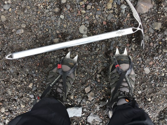 接近冰川的時候,就開始把冰爪穿上去。嚮導也說,冰斧是給你們帶好玩的,其實對於初學者的爬冰川一點用都沒有。