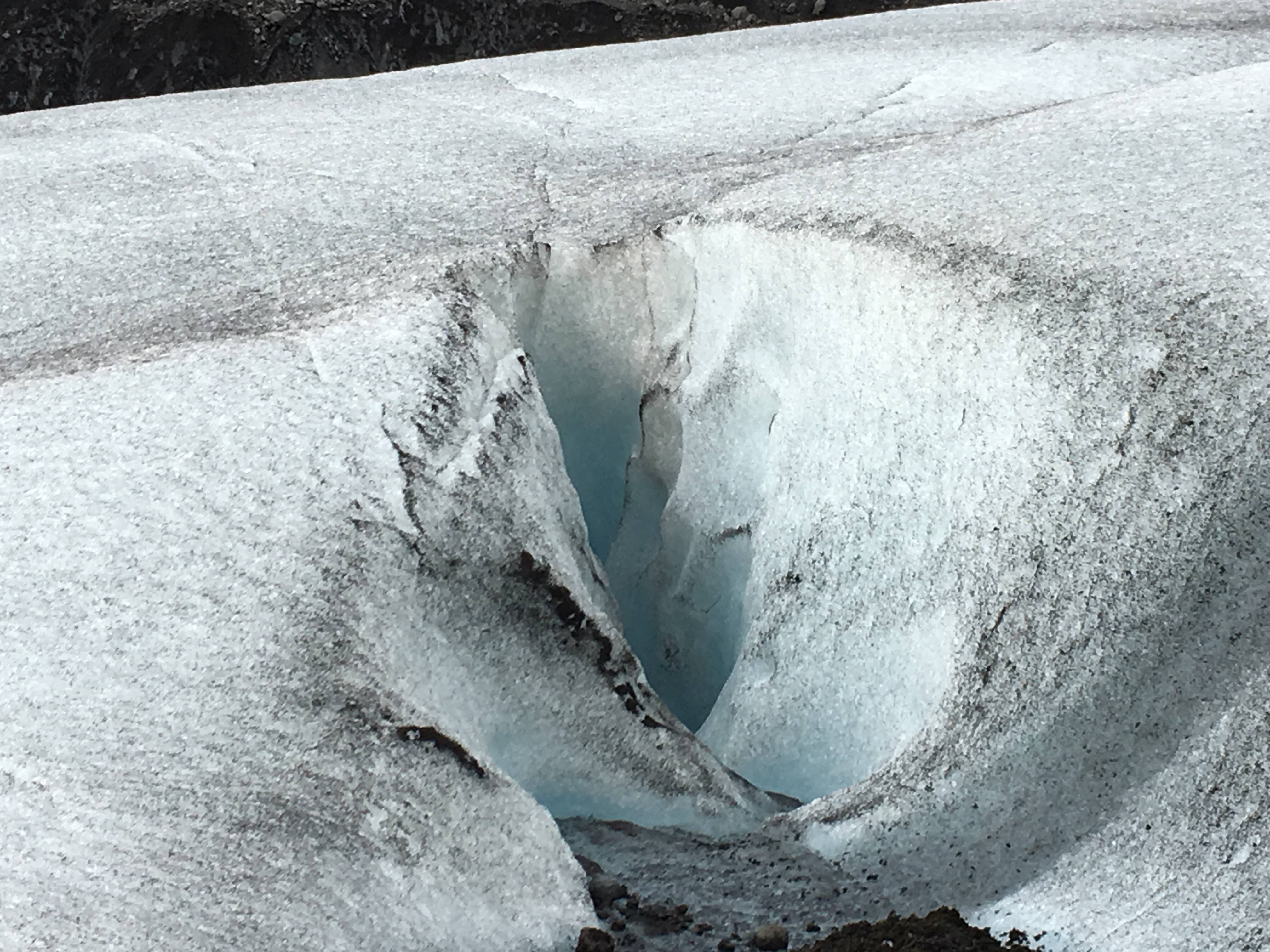 這個行程,預計在冰川上的時間是一個小時。我不斷往上爬,有看到很多的洞,這些洞,嚮導解釋有點像下水道,讓冰川的水可以一路的往河川流動。這個地方,還可以稍微裝一下水喝,天然的冰川水喔。