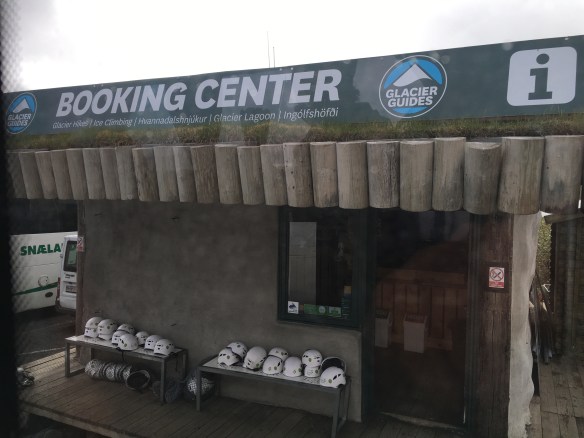離開黑沙灘之後,大約是兩個小時的車程,來到冰川健行的集合地點。我們首先在這邊拿到的冰斧以及冰爪。這邊也提供租借的鞋子。冰川健行,有好幾個公司。我們所報名的叫做:Glacier Guide。