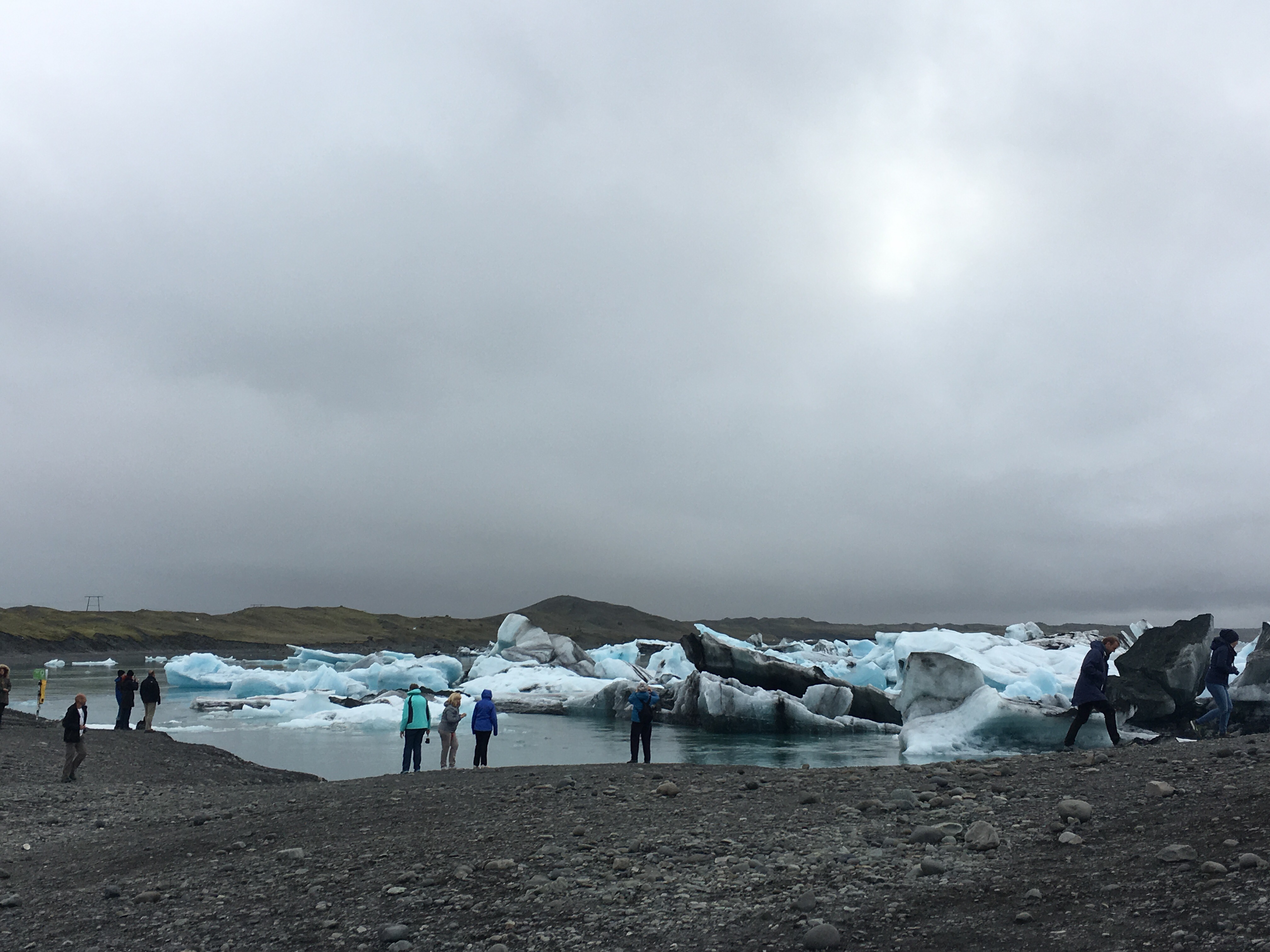 加完油之後,路上又出現了養馬或羊的欄杆,地面也從黑色的土壤或地衣,變成的草地。這邊其實很靠近海邊,所以遠遠的可以看到海。一路往前走終於抵達冰島的著名景點冰河湖。時間已經五點多了,還好我們剛到就買到今天的加班船5:30。聽說這邊的船,好像有橡皮艇或者是鴨子船兩種,我們是鴨子船,價錢是5000克朗。
