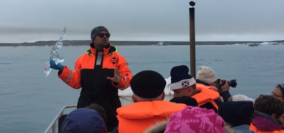 冰島湖的特點,就是在湖上有很多浮冰,然後由於是冰川的關係,這些浮冰都呈現了很漂亮的天藍色。我們跟一團法國的老爺爺老奶奶們坐同一船,船上的介紹人員正好是法國人,所以拿著透明的冰塊熱情的講解。這個透明冰塊,就是超過一千年的冰塊,至於為什麼是一千年,介紹人員說法是一千年前正好是地球開始暖化的時候。