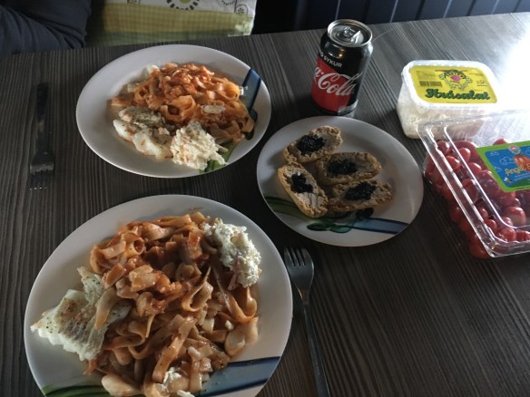 在超市,我們買了3、400克朗左右的鵝肝醬以及魚子醬,這個比起台灣真的是便宜非常的多。為了要充分利用這個美味,我們也買了瑞典的乾麵包,然後在上面塗上鵝肝醬以及魚子醬。美味!