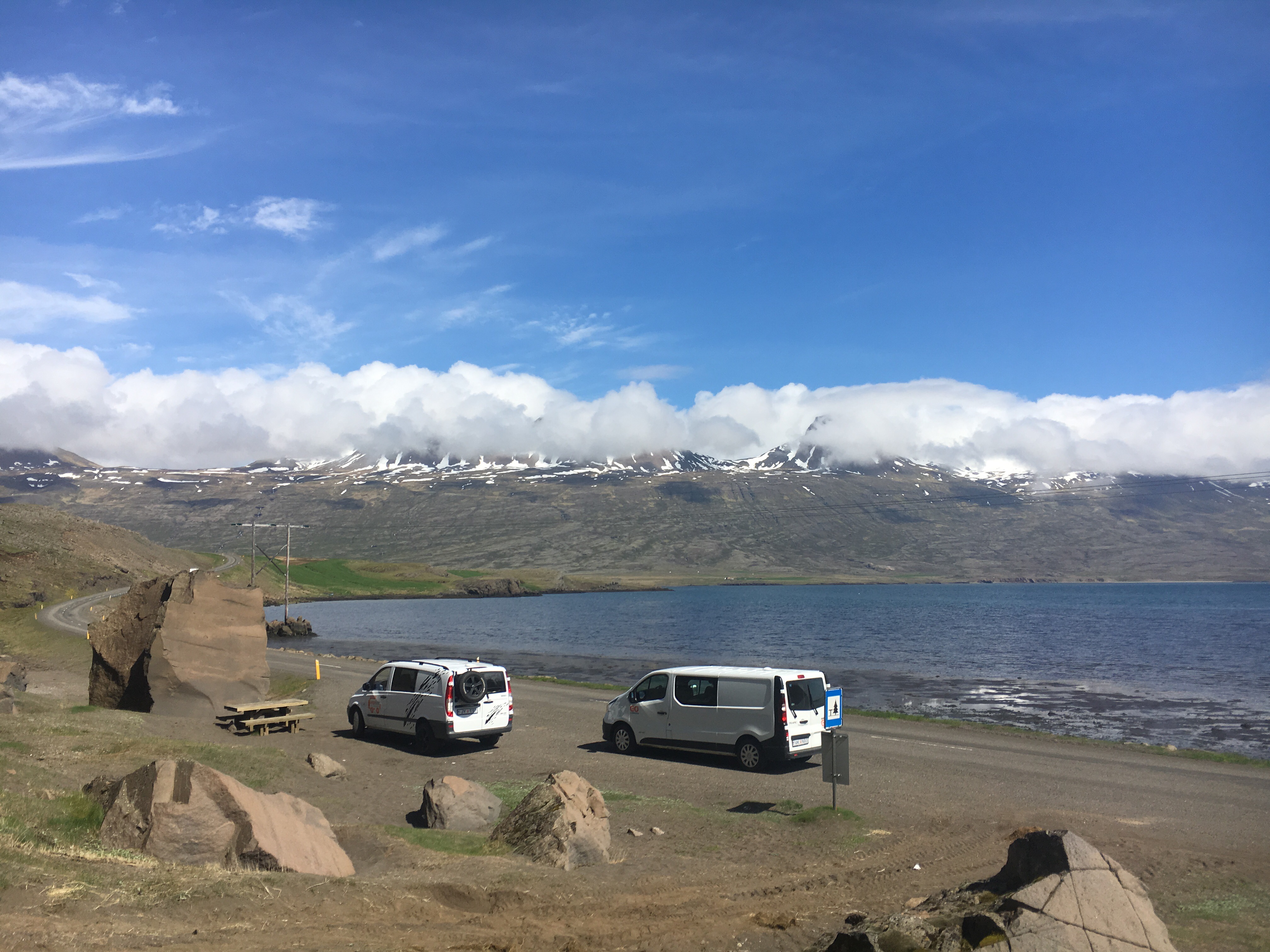 這個時候天氣已經非常好了,從陸地往海面上看基本上沒有什麼雲,但是峽灣兩邊的山可以看得出來山頂上還是有雲。搭配山頂上的積雪,非常漂亮的風景。我們在開車到峽灣的最裡面時開始吃飯。這就是露營車的好處,遇到想停的地方就可以停下來休息一下。