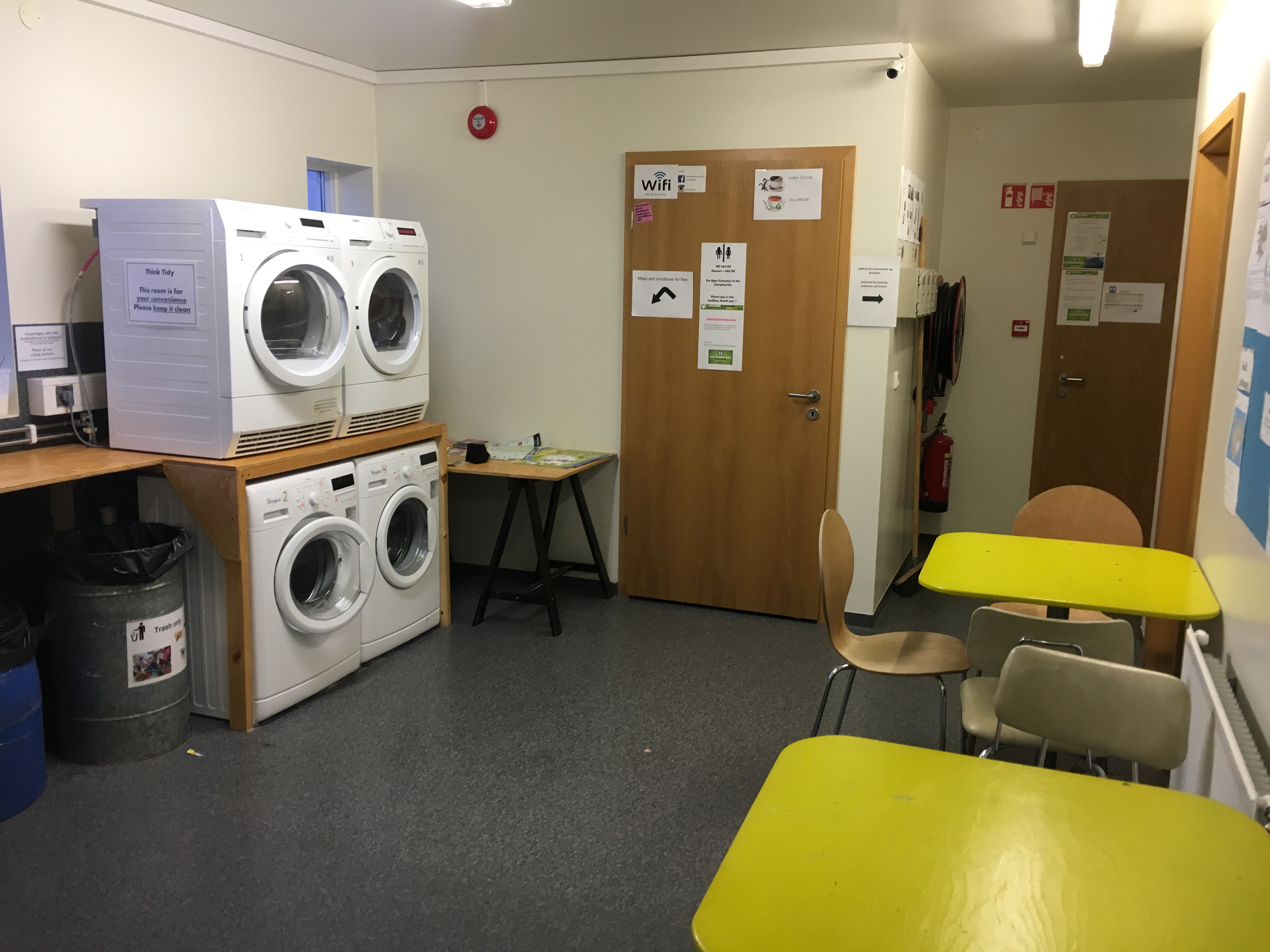 也有洗衣機乾衣機,以及交誼廳。交誼廳裡面有很多相關的旅遊資訊,尤其是公車時刻表。