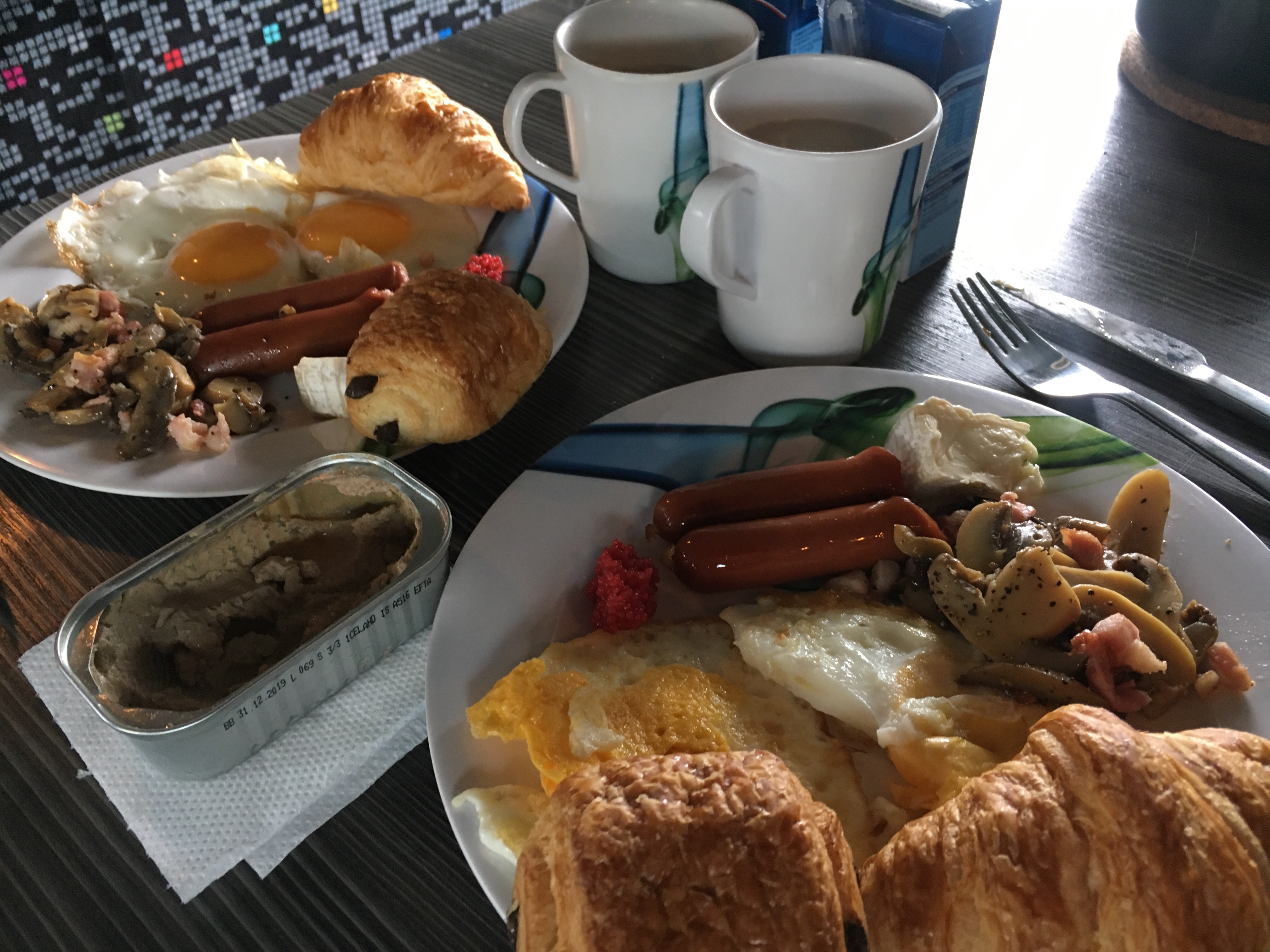 今天早上睡到了八點多才起床,整夜的日光已經對我們一點影響都沒有。今天早上還是鍋煮鴛鴦奶茶,除了荷包蛋之外今天還煎了一些洋菇。